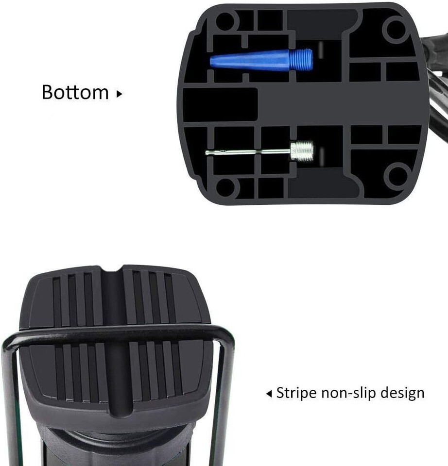 ??Multifunctional Twin Valves?Newly designed valve head can easily switch between Presta and Schrader valves and without any air leaks. The tire pump can inflate for bicycles, electric vehicles, motorcycles, sports balls and swimming rings.