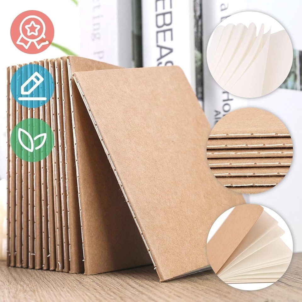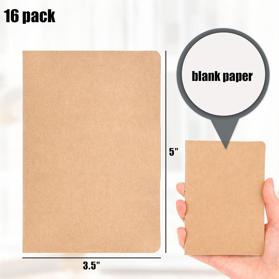 Package Content: 16PCS blank paper journal notebooks with Kraft paper cover, 60 pages/30 sheets and 80gsm paper.