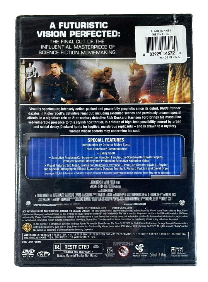 "Blade Runner: The Final Cut" is a classic science fiction movie released on DVD in 2007. Directed by Ridley Scott and produced by various industry professionals, this version is rated R and has a run time of 116 minutes. It includes subtitles in English, French, and Spanish. The DVD is from Warner Home Video and is brand new.