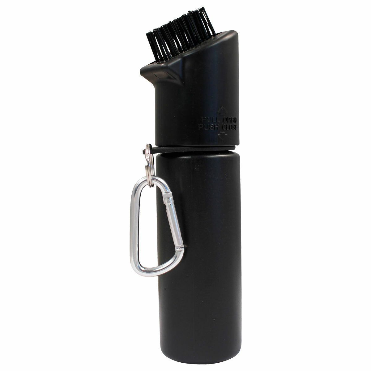 Unscrew the top and fill the bottle with water. After replacing the top, simply pull it upwards until you hear a 'click' and scrub the club with the nylon brush facing downward whilst at the same time squeezing the bottle enabling the water inside to flow through. The water bottle club cleaner also features a clip allowing it to be hung on a golf bag.