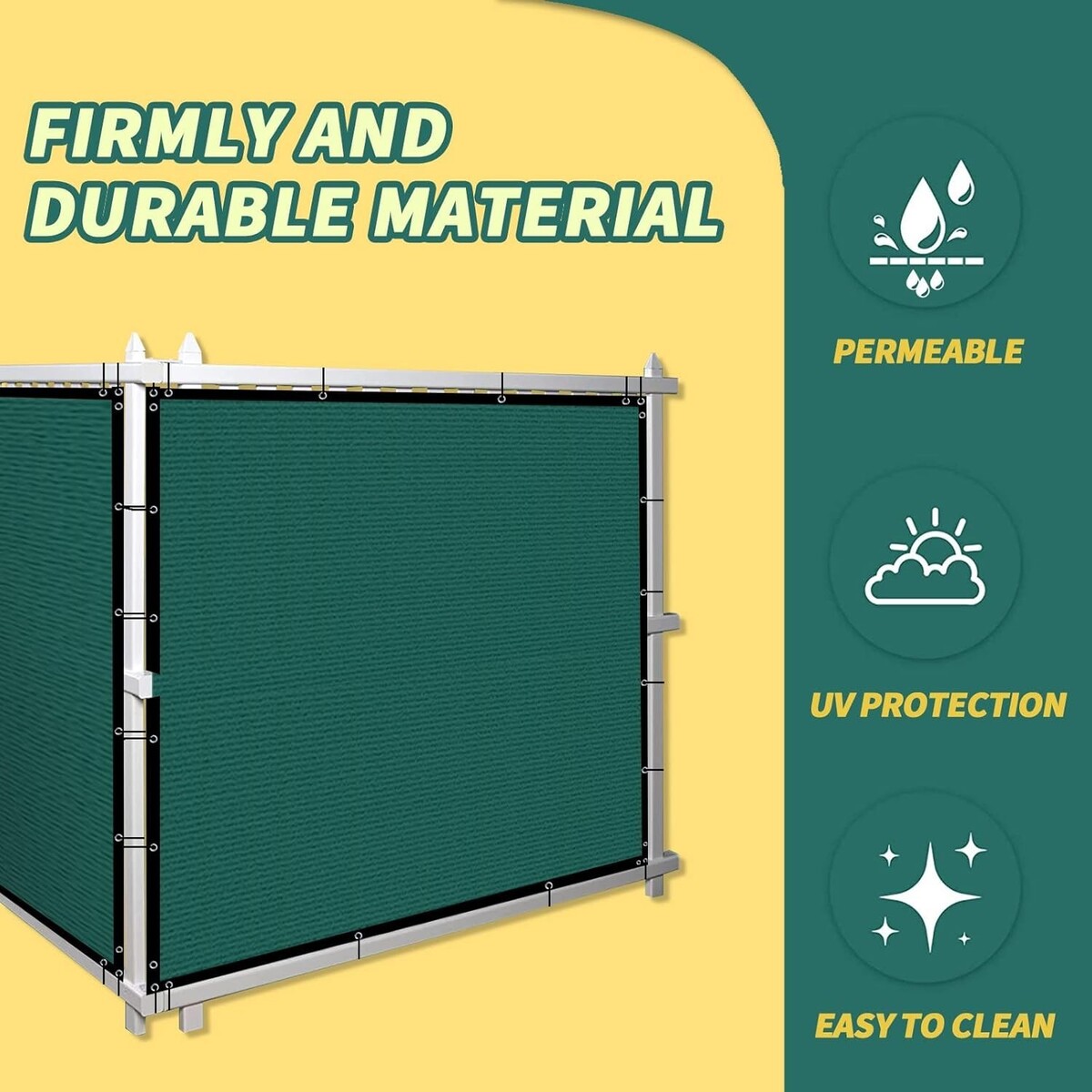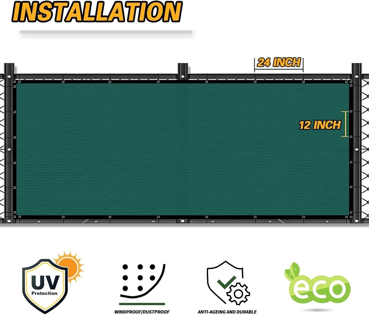 ? Privacy Fence Screen with GROMMETS: The aluminium buckle is resistant to oxidation and does not rust.Grommets are placed every 11.8in vertically, 24in horizontally, each corner has 3 grommets.Easy to install on your yard and garden.3.5cm hemming with black Reinforced edges make your privacy fence screen to serve longer life.and not be torn apart easily.