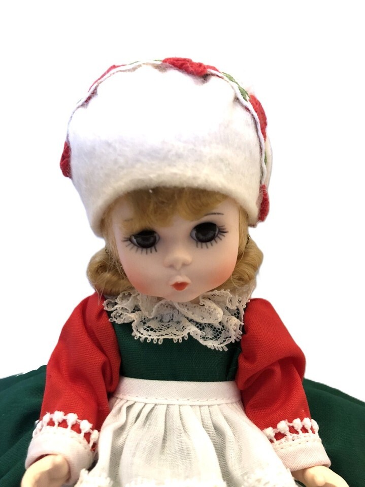 This 8" Madame Alexander Miss Denmark doll has straight legs and was made around 1985-1987. The doll is in very good condition for her age and maybe missing her shaw. She has blonde hair and flutter sleep eyes that still open and close. The doll does have her undergarments, shoes, socks and hat. The doll does not come with her booklet, box or stand. I do have more dolls available and offer combined shipping in cart when you purchase two or more items from my shop.