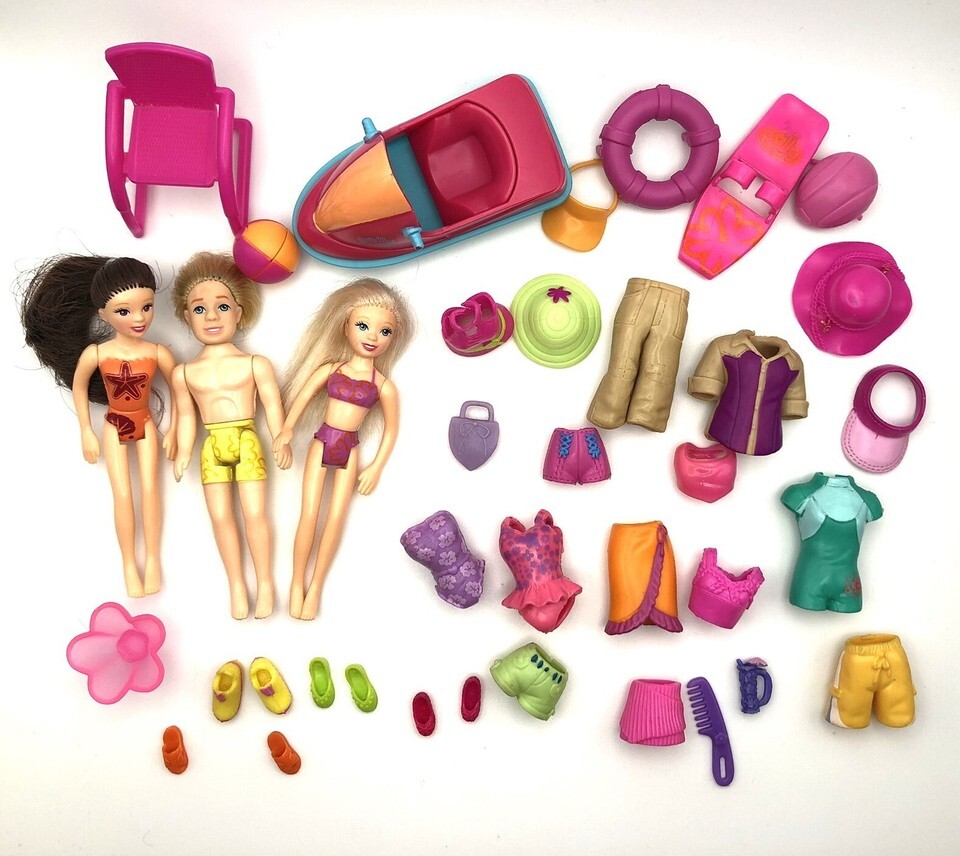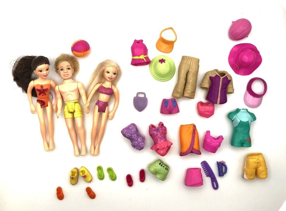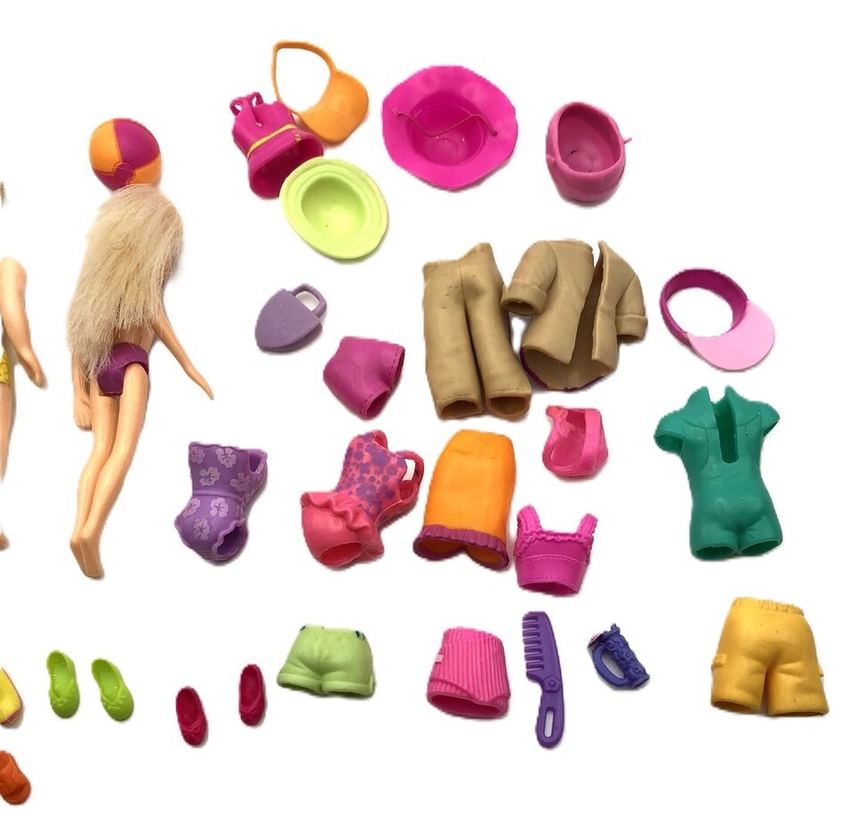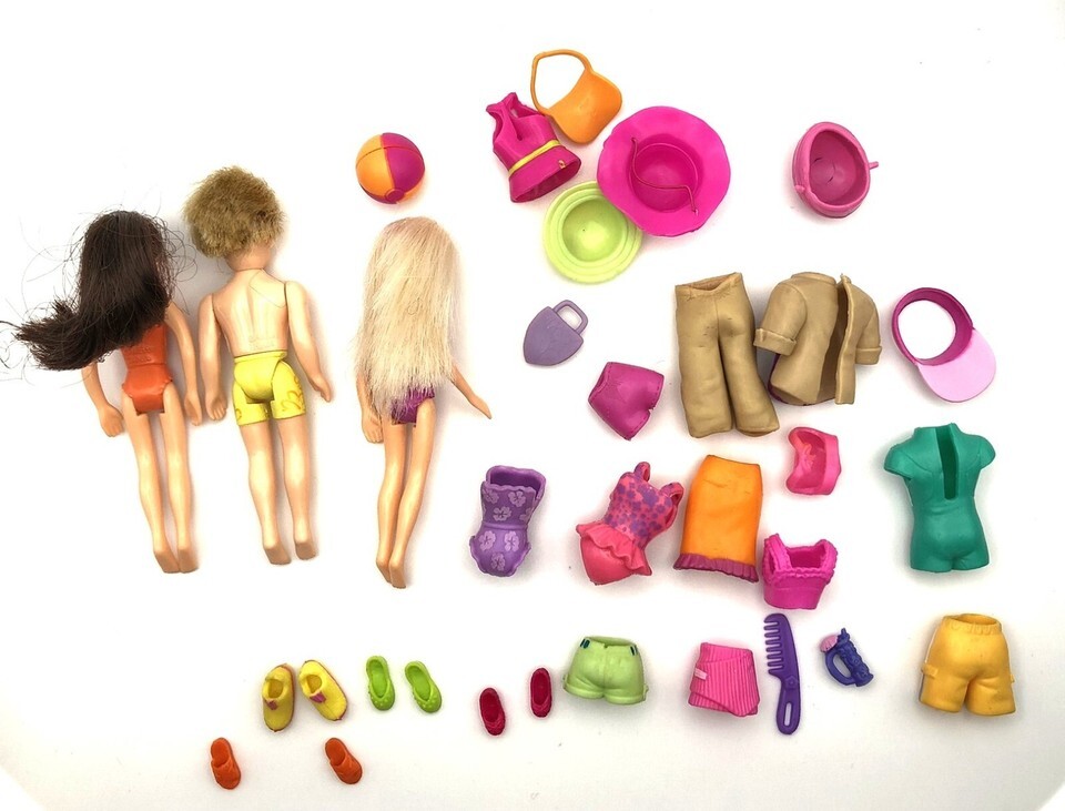 Polly Pocket Dolls Polly, Rick Lila Dolls, Clothing, Shoes, and Accessories, 30+ piece set. The set comes with everything shown in the pictures. The clothing is made with a rubber material and the dolls are around 3 oe inches tall. The dolls and clothing are in good, pre-owned condition and do show a little wear from play. I do have more Polly Pocket dolls and mini dolls at my shop. Calculated shipping is applied to cart when you purchase multiple items at my shop.