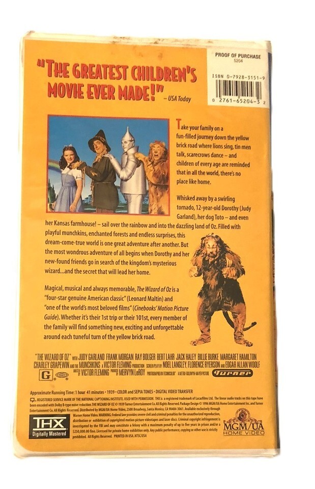 MGM Entertainment The Wizard of Oz VHS Tape Clamshell Cover. The tape and cover are in good clean pre-owned condition, the tape has been tested and is in working condition. I do have more VHS tapes and calculated shipping is applied to cart when you purchase multiple items at my shop.