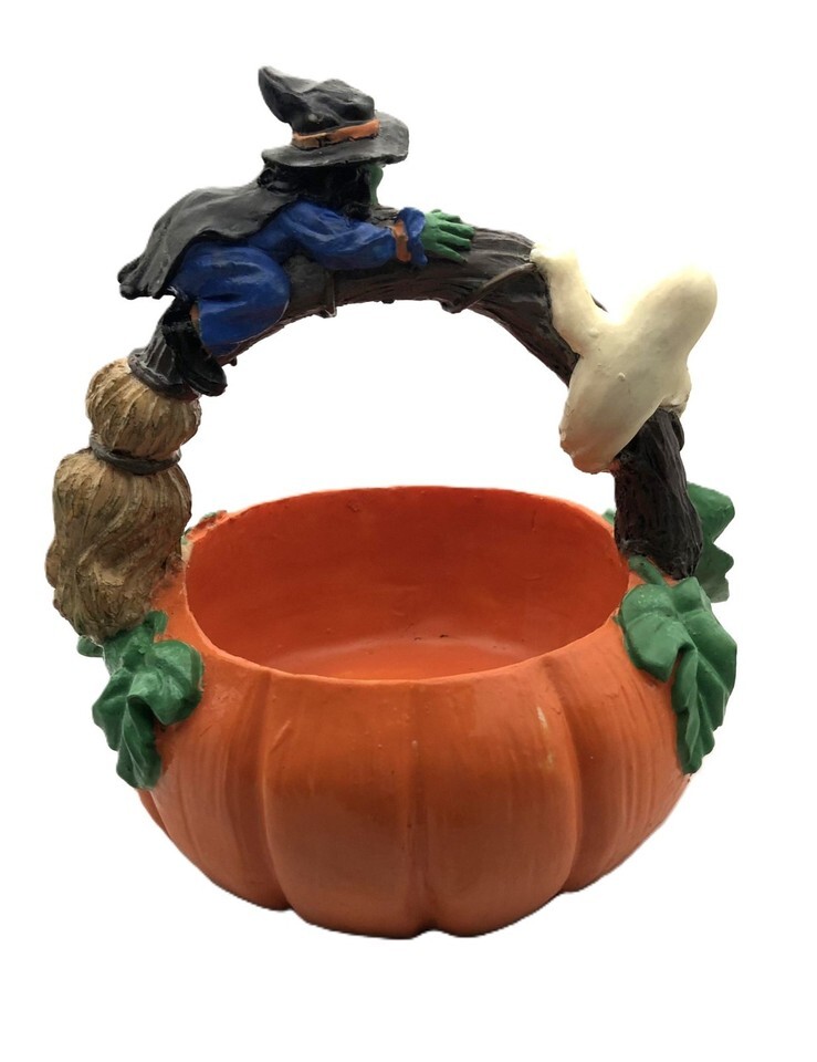Ceramic Halloween Pumpkin, Witch on Broom Ghost Candy Basket. The basket is 7 inches high and 5 inches wide.