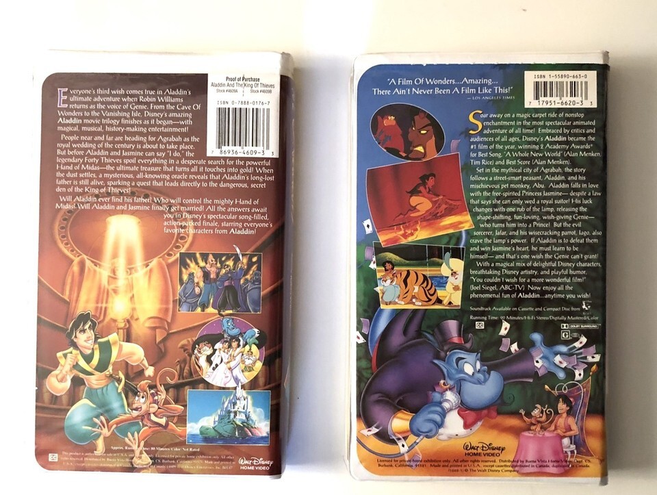 Walt Disney Classic Aladdin, King of Thieves, The Return of Jafar Arabian Adventures 4 VHS Tapes. The tapes and covers are in good clean pre-owned condition, the tape has been tested and is in working condition. I do have more VHS tapes and calculated shipping is applied to cart when you purchase multiple items at my shop.
