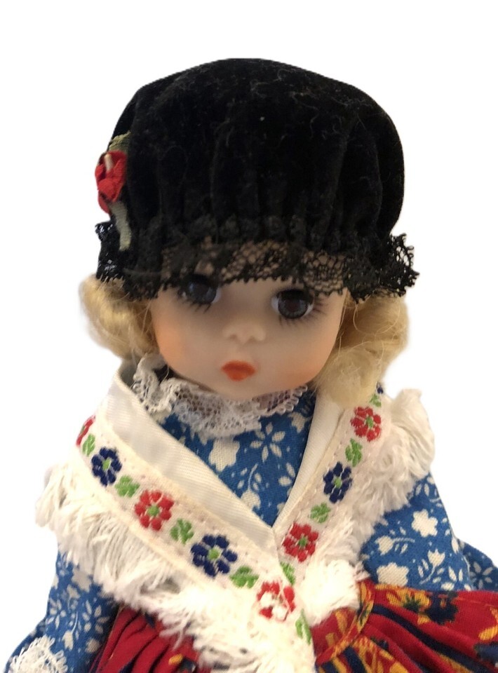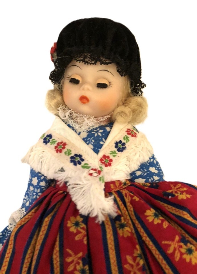 This 8" Madame Alexander Germany doll is part of the international collection. She is in really good condition for her age. She has blue eyes and blonde hair, flutter sleep eyes that still open and close. She is wearing a blue and white floral dress along with a red apron with flowers and stripes and a black hat. Her shoes, socks and underclothes are all intact. The doll does not come with her original box, booklet or stand. I do have more dolls at my shop and offer combined shipping when you purchase two or more items.