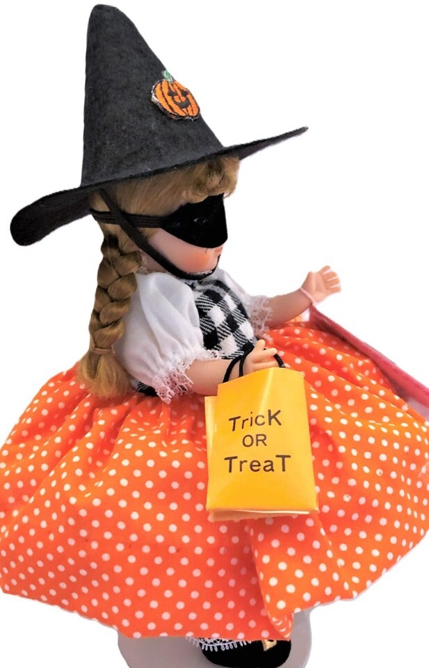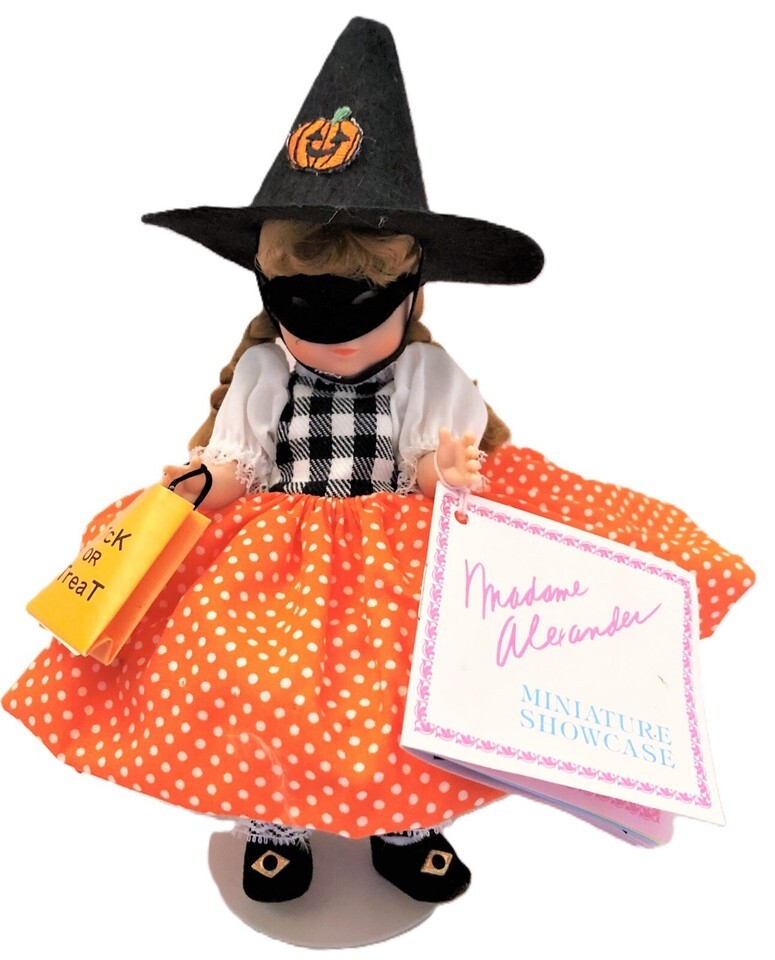This rare 8" Madame Alexander Greenville Halloween Special Doll Vintage from the miniature Showcase Series has straight legs and was made in 1990. The doll has been re-strung and is in very good condition for her age. She has blonde hair and flutter sleep eyes that open and close. The doll does come with a tag book, box, her white laced trimmed petticoat and pantaloons, striped socks and black velvet shoes. The box may show a little wear from storage. The doll does not come with a doll stand. Please review all photos for condition. I do have more Madame Alexander dolls and I offer calculated shipping in cart when you purchase multiple items from my shop.