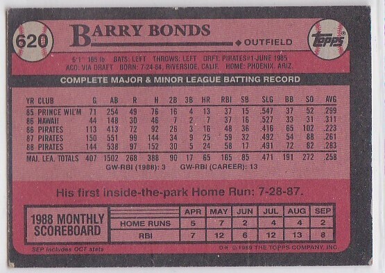 N) 1989 Topps Baseball Trading Card - Barry Bonds #620