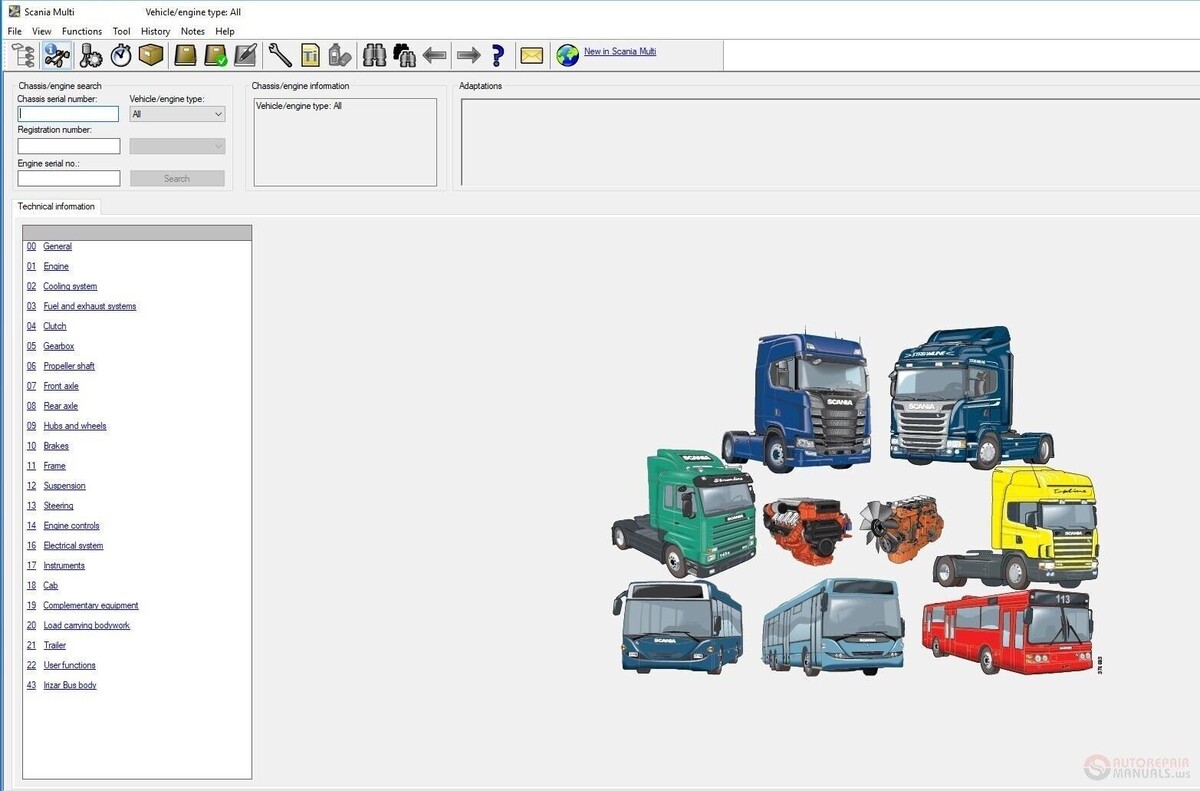 Windows application in electronic format in MULTILINGUAL language that allows you to consult all the service and repair procedures, the list of spare parts, the wiring diagrams. All mechanical and electrical systems, technical modifications, bodywork and sheet metal, engines, transmission, gearbox, suspension, steering, brakes, interior and many other Scania truck and bus service information. The electronic program is designed to quickly and efficiently search for repair information on the automobile or industrial and marine engines. The electronic program allows you to serve Scania trucks quickly and easily, solve problems and solve problems. Languages: English, Dutch, Spanish, Italian, German, French, Persian, Finnish, Russian, Thai, Turkish, Zwedish, Chinese, Czech, Japanese, Korean, Po
