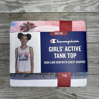 The Champion Girl's Active Tank Top T-Shirt in size 7/8 features a high-low hem and a chest graphic with the Champion logo. This sleeveless top is made of a blended fabric of 91% polyester and 9% spandex, making it lightweight, comfortable, and breathable for all seasons. The white shirt with a pastel graphic is perfect for casual occasions, and the pullover closure and crew neck neckline add to its easy-care and soft feel. Ideal for active young girls, this modern and novelty-themed t-shirt is a basic yet stylish addition to their wardrobe.