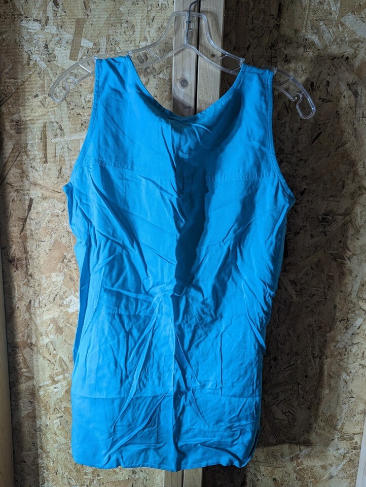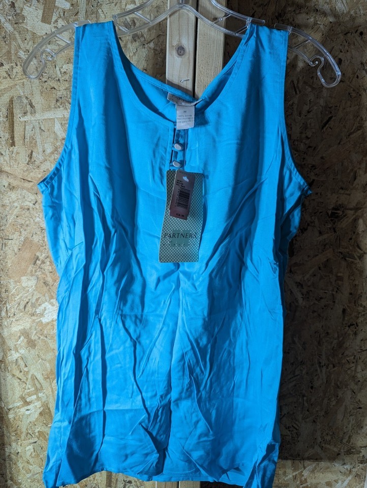 This is a light blue Partners tank top for women, made of 100% rayon fabric. It has a V-neckline, button closure, and is sleeveless. The tank top is a solid color and has a basic style. It is available in a medium size and is machine washable. The vintage tank top is woven and not handmade.