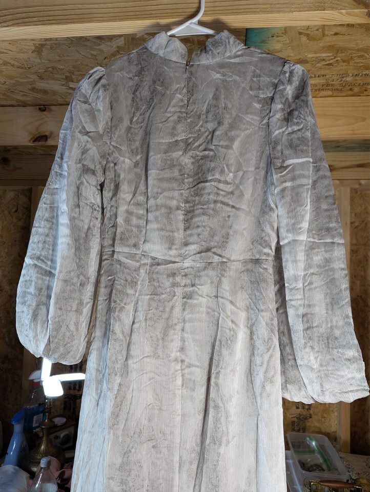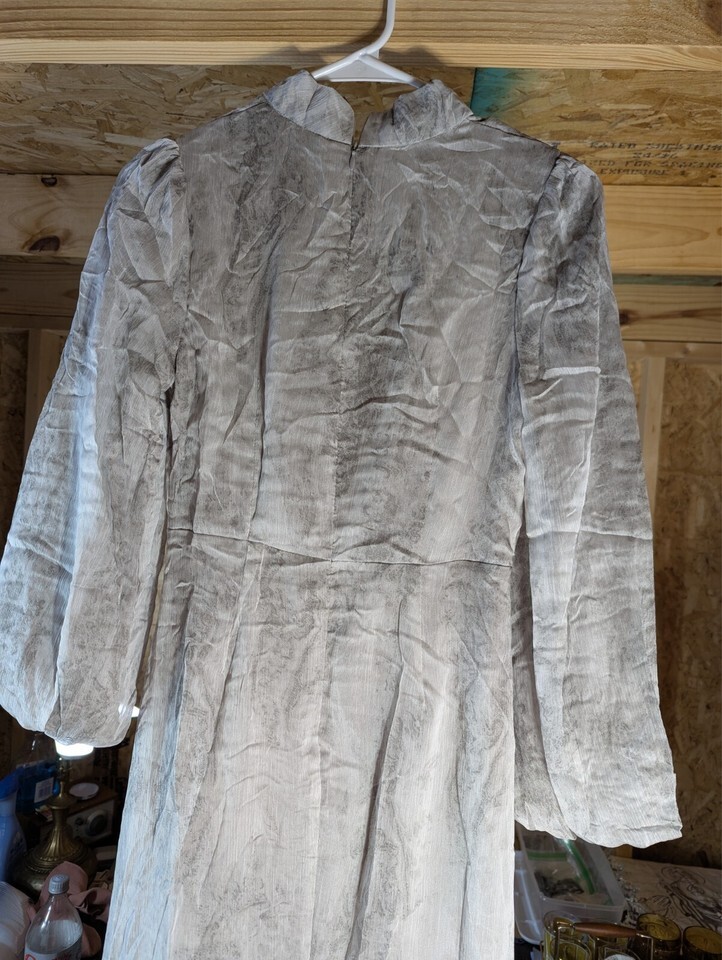 This LaMeera dress in size XS features a floral pattern and is made of gray polyester. It has long sleeves, a round neckline, and a zip closure. The A-line dress is suitable for various occasions like weddings, parties, or business events. It is machine washable and has a lined and sheer design, making it a versatile piece for different seasons.