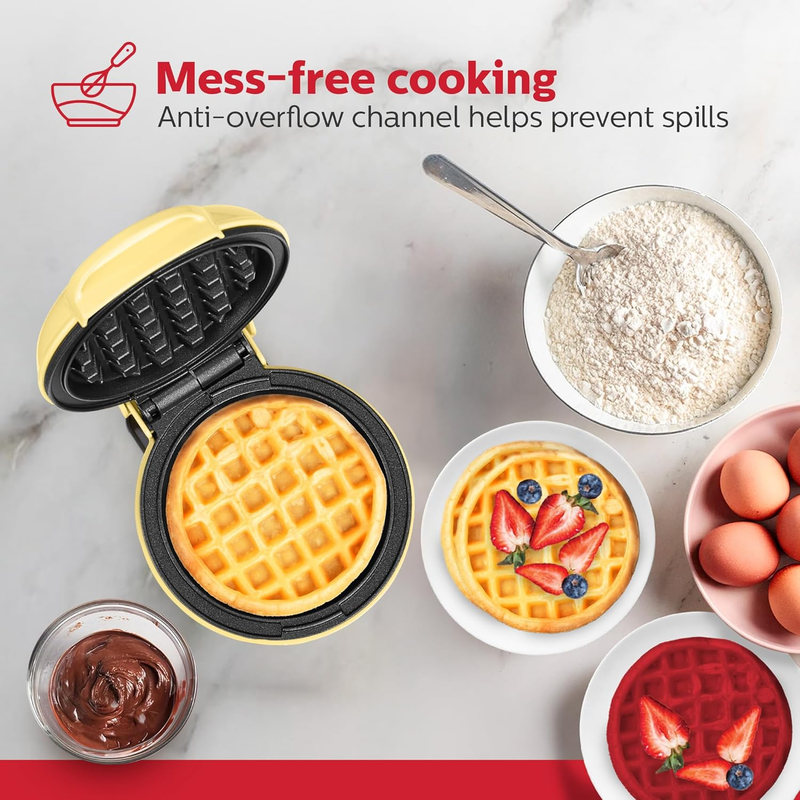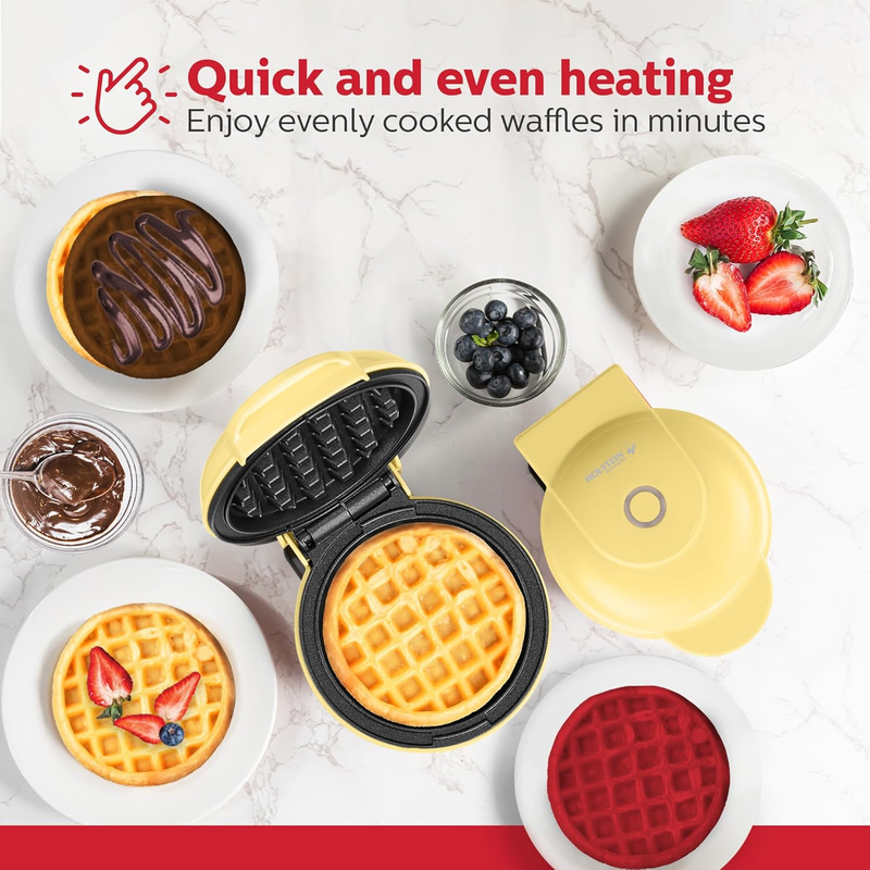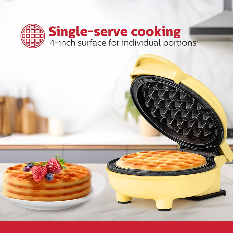Personal/Mini Waffle Maker, Non-Stick Coating, Yellow - 4-Inch Waffles in Minutes, Ideal for Breakfast, Brunch, Lunch or Snacks
