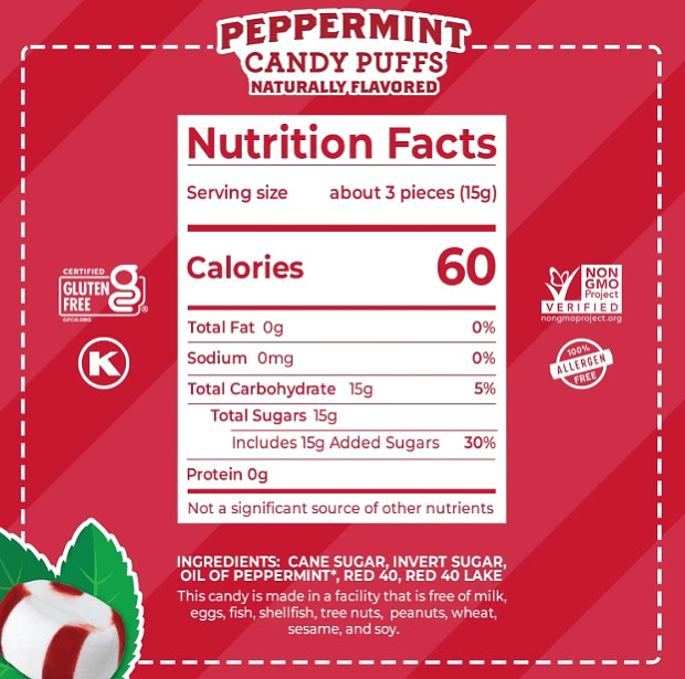 Large Peppermint Puffs. Large puffed peppermint red and white stripe pillow candies, crunchy then melt in your mouth, individually wrapped. Bulk bag options of 8 oz, 1lb,or 3lb. New, direct from supplier.
