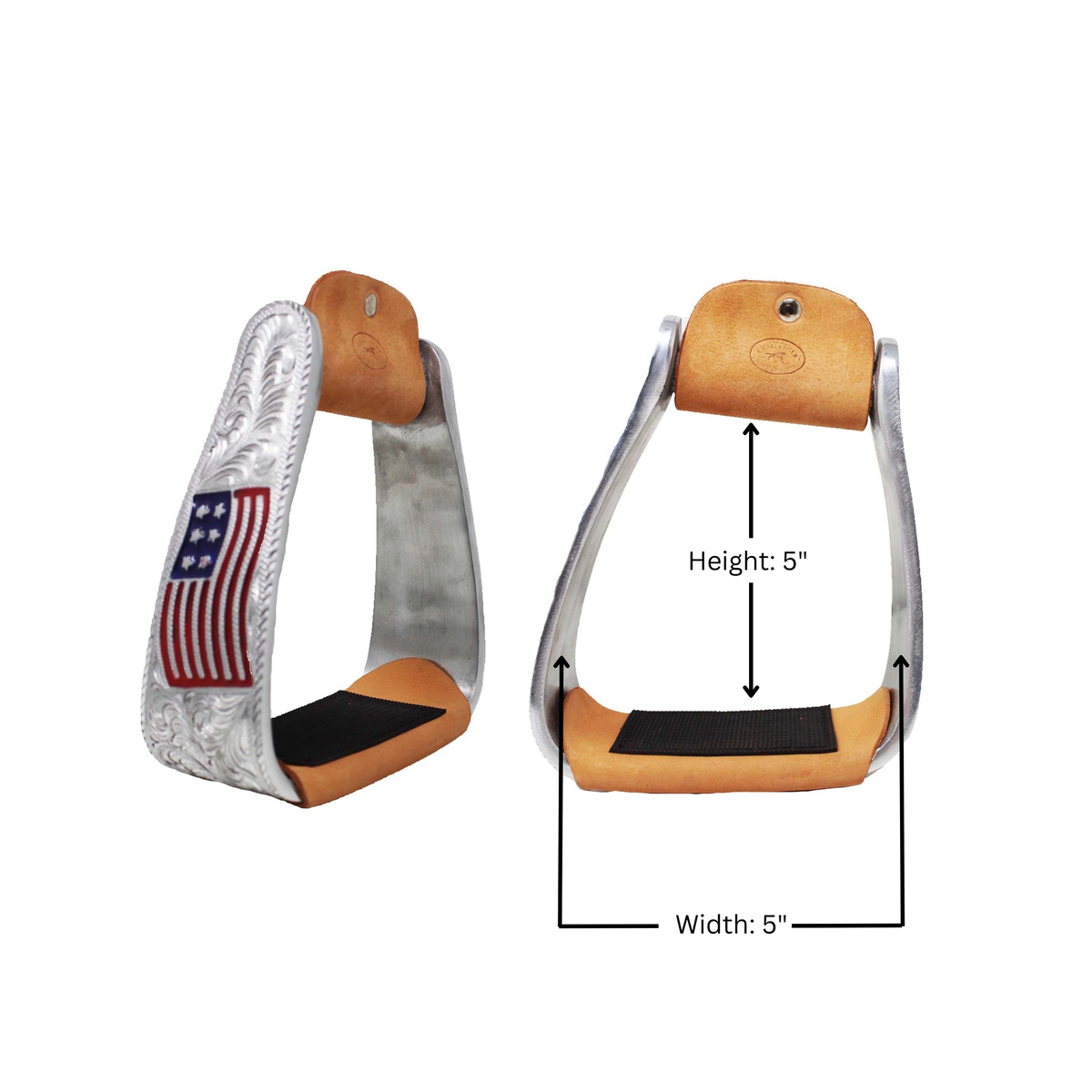 Challenger angled offset show western stirrups made of lightweight, yet durable aluminum. The angled shape allows your foot to be flat across the tread which gives you a more comfortable ride without the stress on your knees. Stirrups come accented with an American flag inlay, and silver engraving. Features tan leather accents, and a rubber padded tread providing grip to help with slippage. Inner measurements are as follows; 5" wide, 5" height, 3" neck, 2-1/2" tread. Sold as pair.