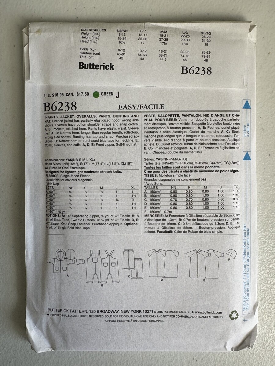 Butterick B6238 Pattern YA5 All Sizes Uncut Vintage Baby Layette 2015 - This is a new, uncut pattern - UPC #031664462743 - See Photos for further description.