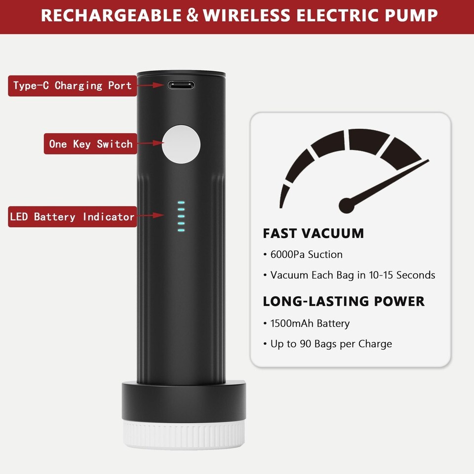 Rechargeable Wireless Electric Pump: Effortlessly enhance your packing and storage efficiency with our state-of-the-art wireless electric pump. Powered by a 1500mAh battery, it allows you to compress up to 90 bags per charge. With 6000Pa suction, it can compress a bag in 10-15 seconds.