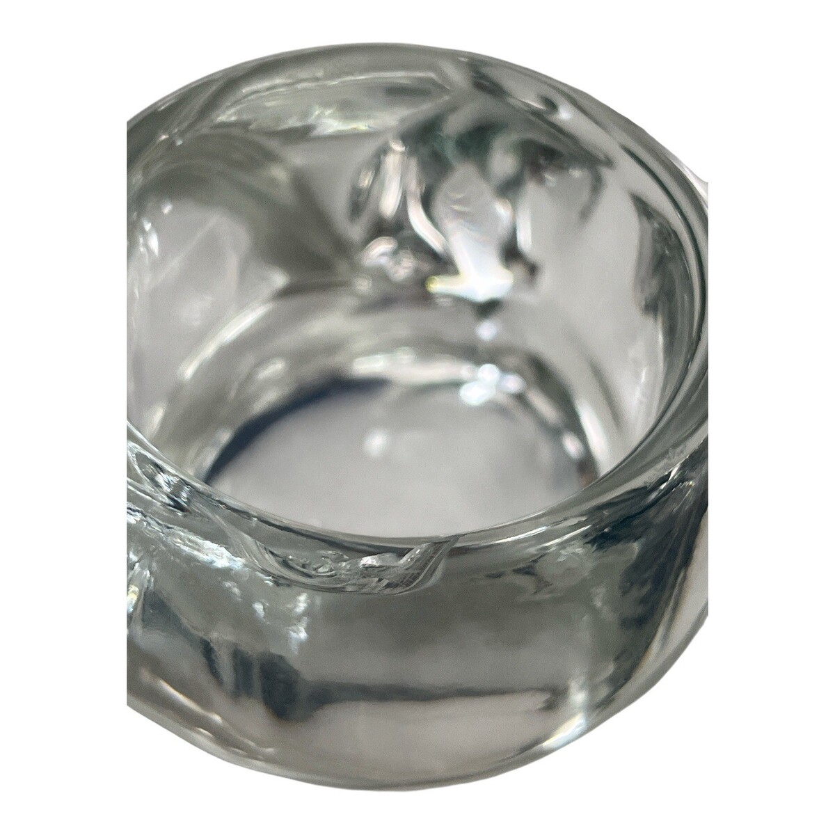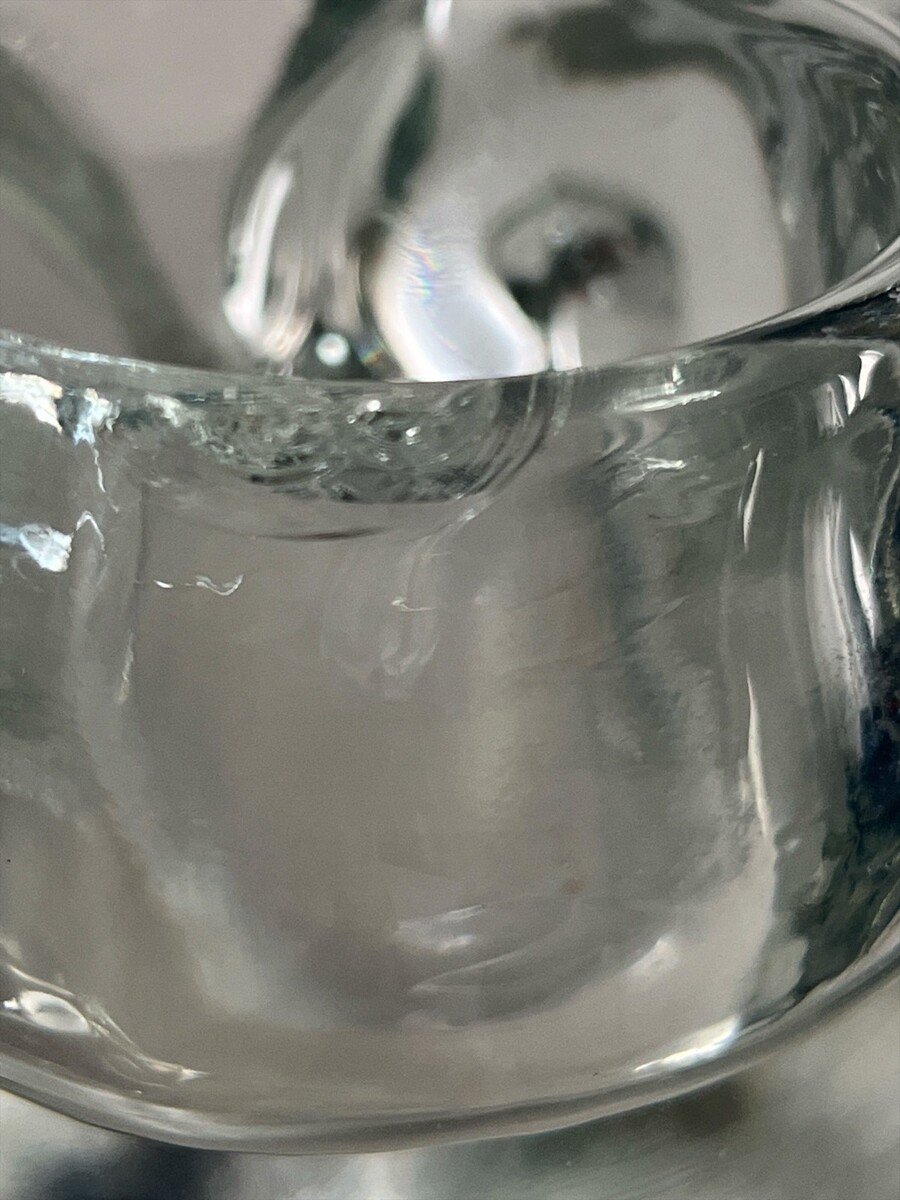 Good condition overall with light surface wear. There is a small flaw/rough spot on the rim that can be felt to the touch but is not very noticeable?see photos. Also has typical small manufacturing bubbles and marks.