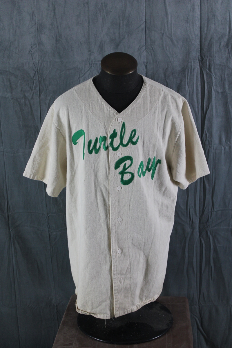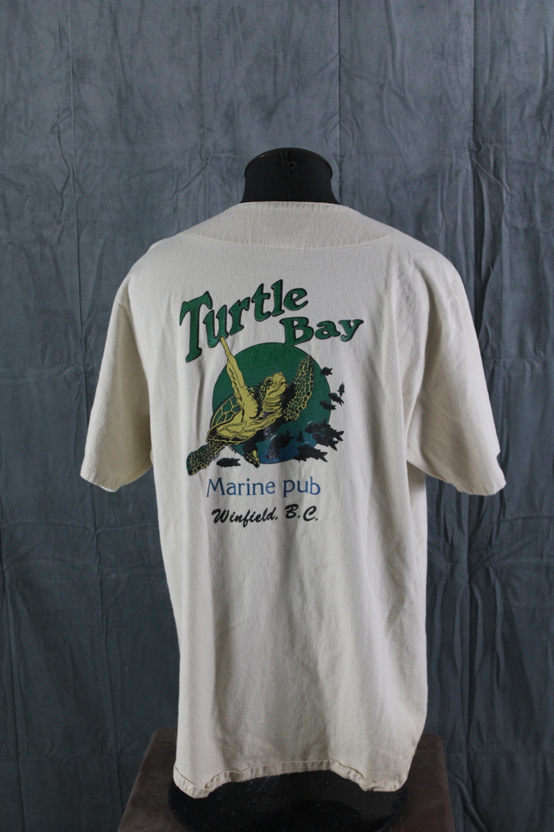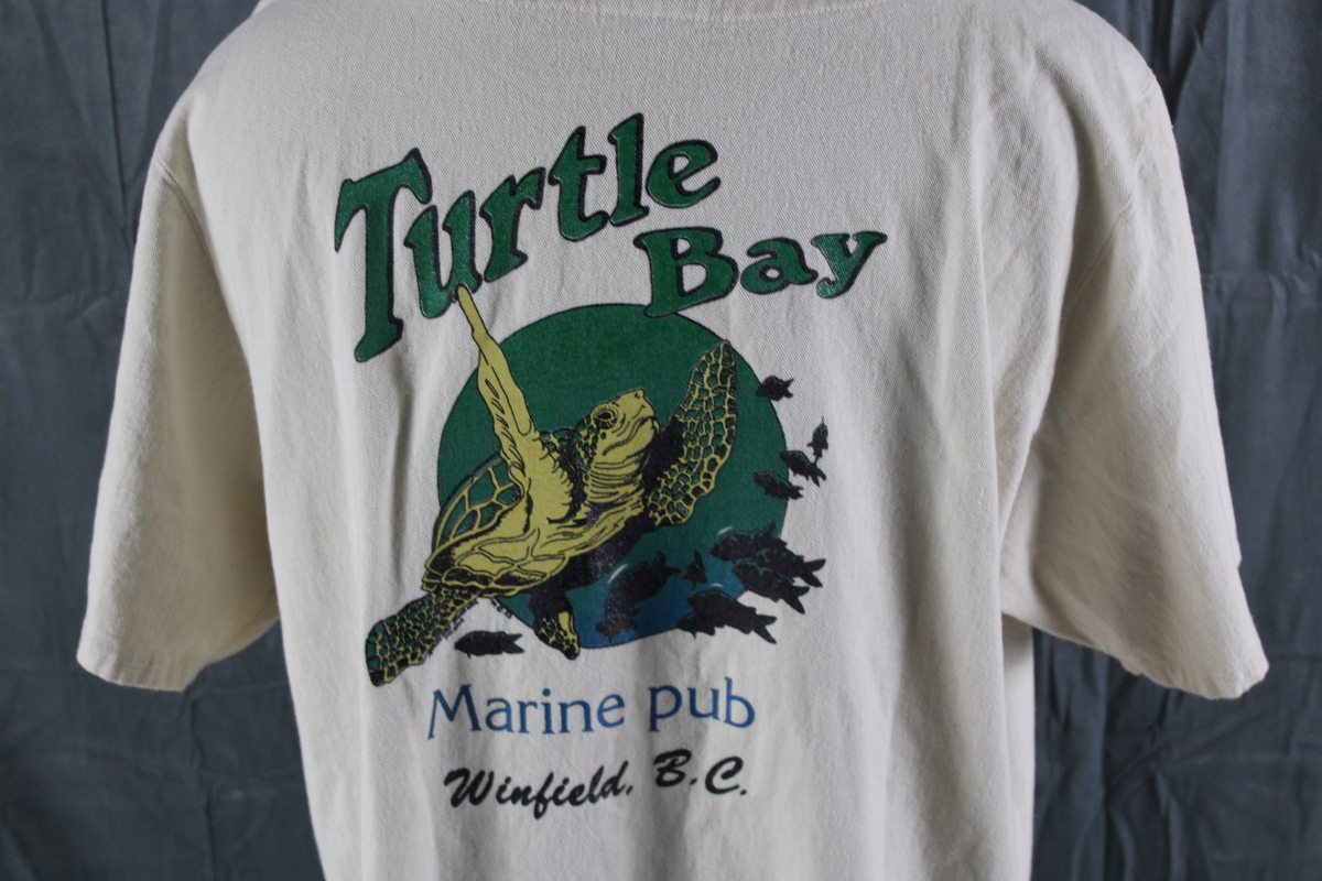 Up for sale is a vintage baseball jersey. It has a cream base colour with Turtle Bay in green script crested on the chest. The back of the jersey has a graphic of a sea turtle with Turtle Bay Pub underneath. What a great shirt do not miss out on it.