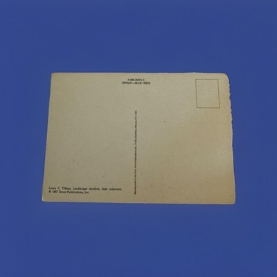 The product is a vintage postcard featuring a Tiffany Blue Trees Landscape Window from Dover, 1987. This printed lithograph postcard captures a beautiful landscape scene with an art theme, making it a unique and collectible item for postcard enthusiasts. The postcard is from the Photochrome era and was manufactured in the United States, adding to its appeal for collectors interested in non-topographical postcards from that time period.