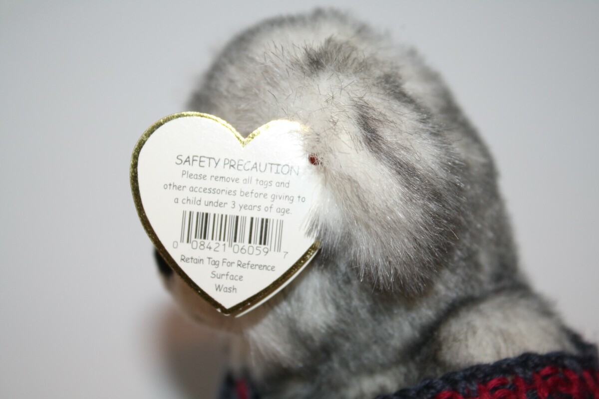 Features: Soft Pretty Gray Tipped/White Plush Material, Wearing an over sized knit sweater, Plastic eyes, Stitched nose and mouth, Jointed Neck, Arms and Legs, Paper hang tag and Seam tag intact