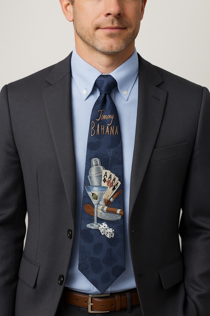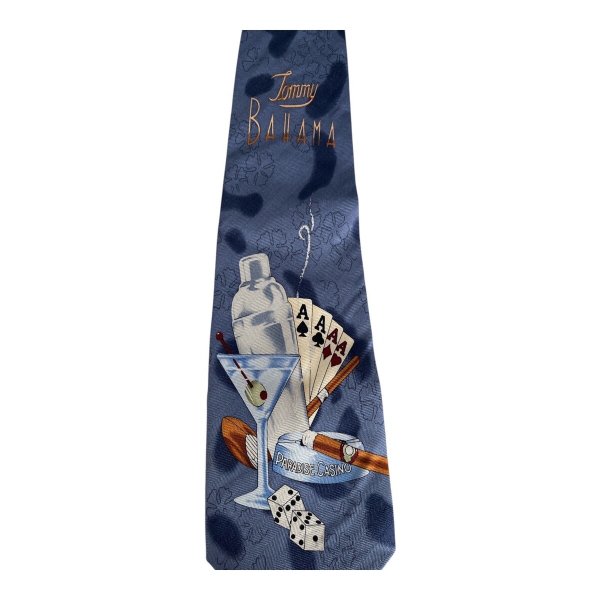 Tommy Bahama 100% silk necktie featuring the ?Paradise Casino? theme with martini glass, shaker, cigar, dice, and four aces graphic. Deep blue background with tonal hibiscus patterning. A bold, collectible novelty tie with signature Tommy Bahama island-casino styling.