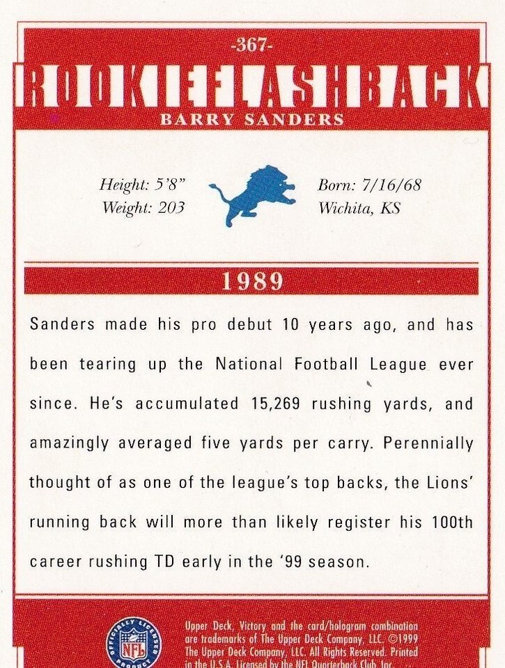 1999 Upper Deck Victory Barry Sanders Detroit Lions #367 Football Card