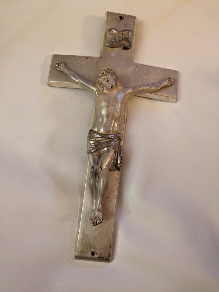 Vintage INRI Metal Crucifix Cross Casket Coffin Wall Hanger 14 Inch Tall Silver