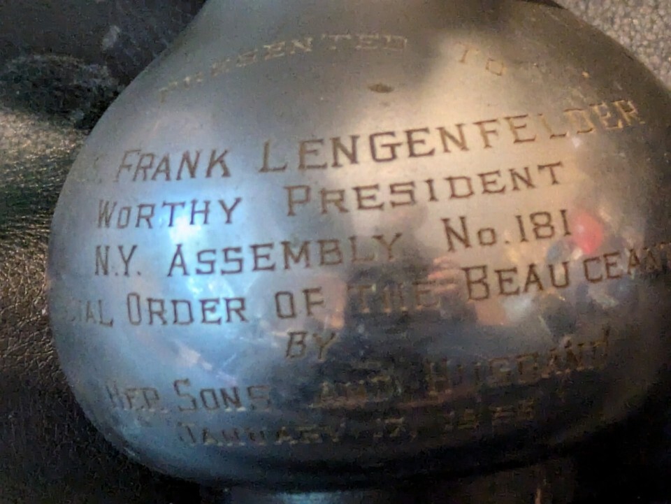 This historic maul gavel, measuring 9 inches in height, is a rare find for any Masonic or fraternal organization enthusiast. Crafted in the United States in 1959, it features intricate engraving and is a unique piece of historical memorabilia. The gavel is perfect for anyone looking to add a touch of nostalgia to their collection or for those who appreciate the history of Freemasonry. With its Masonic organization and Fraternal Organizations categories, this collectible is a must-have for any serious collector. Engraved: Presented to Mrs. Frank Lengenfelder Worthy President NY Assembly No. 181 Social Order of the BeauCeant By Her Sons and Husband January 17 1959