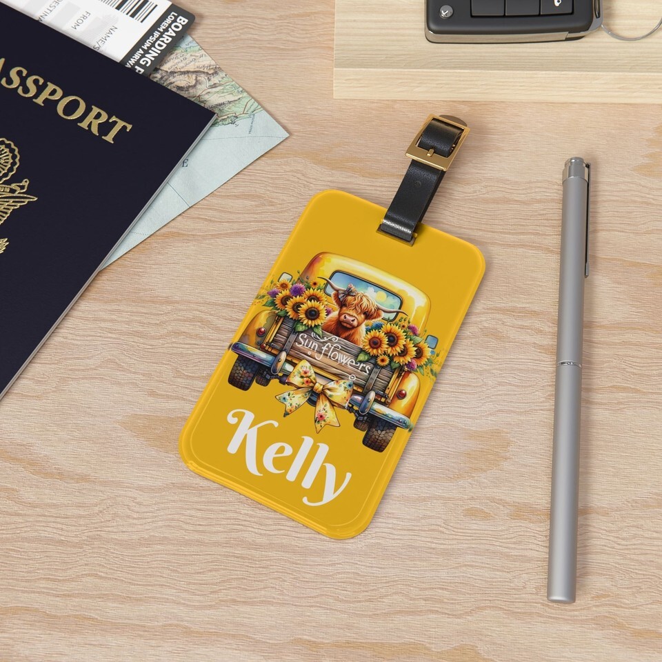 PERSONALIZED NAME Highland Cow Sunflowers Travel Truck Luggage Tag