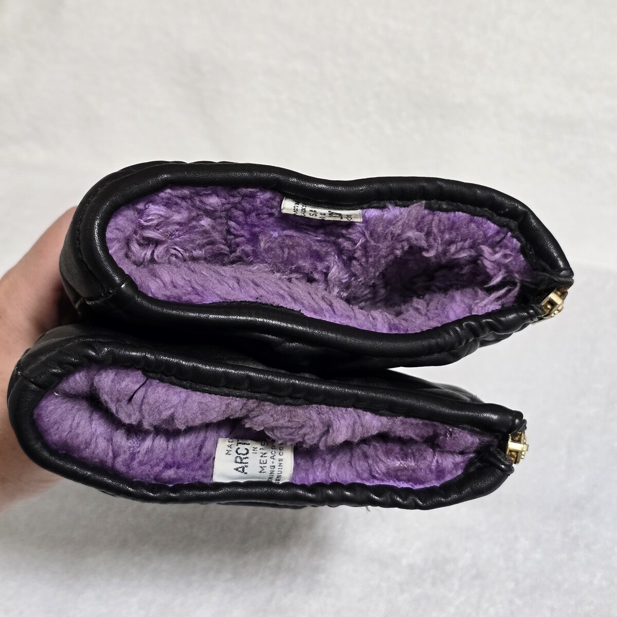 Excellent Condition Vintage 90s Arctic Cat Black Leather / Acrylic Pile Purple Lining Snowmobile Gloves Men's XL. Approximately 13" length.