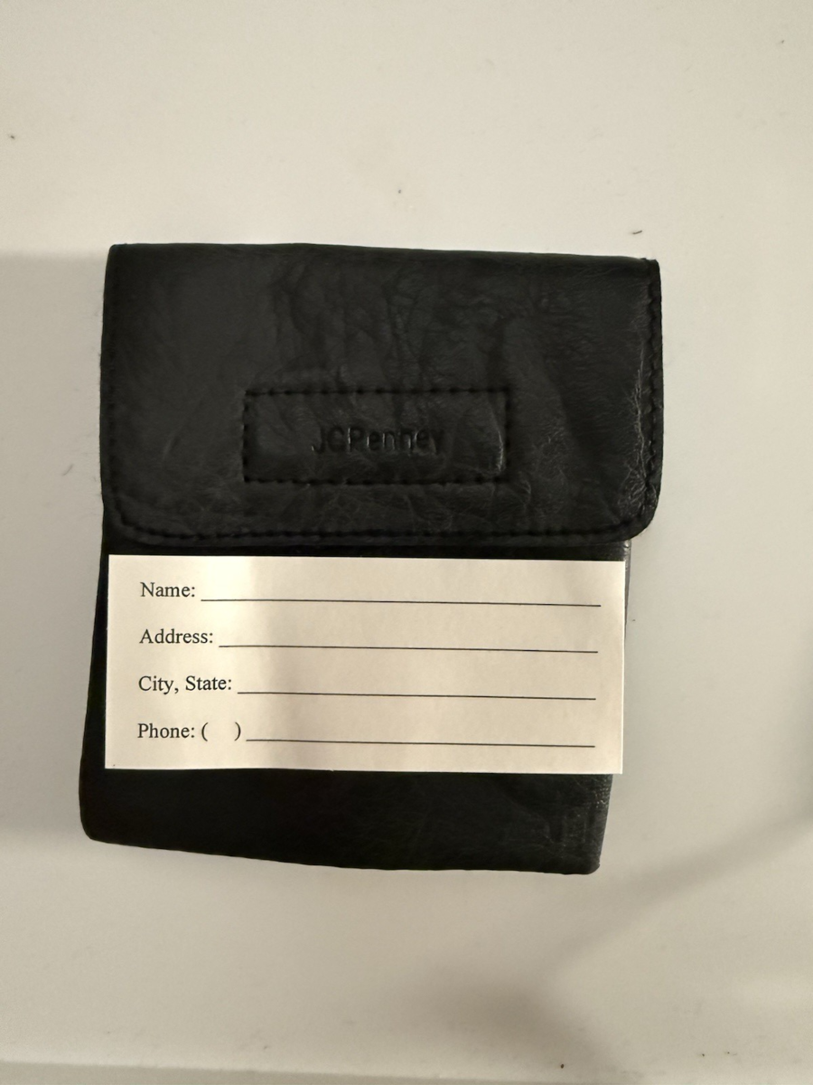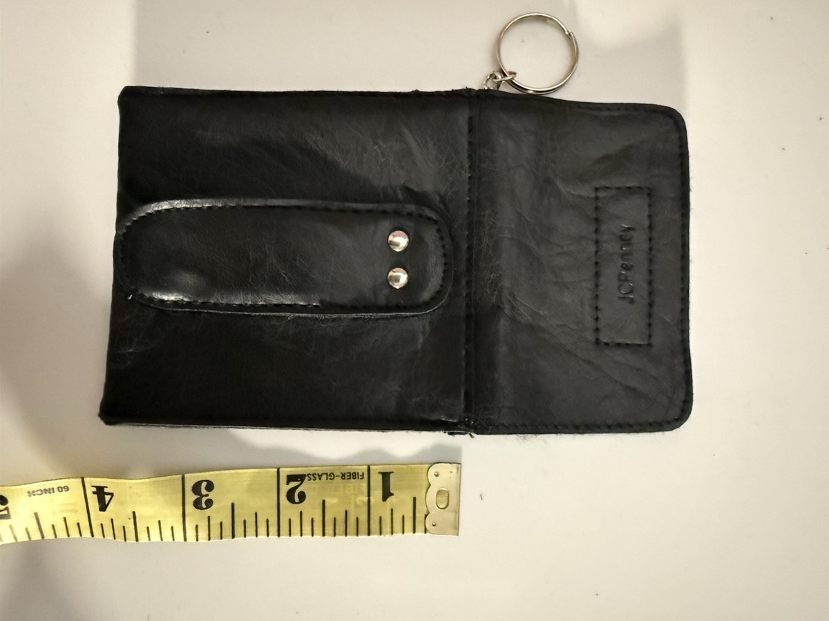 JCPenney black faux leather coin purse with keychain, originally given as a Susan G. Komen Race for the Cure promotional gift. This compact wallet features a secure Velcro flap, interior pocket for coins, cash or ID, side key ring, and belt-loop style strap on the back. New old stock with ?Made in China? tag and original JCPenney breast cancer awareness insert, perfect for everyday use, gifting, or collectors of JCPenney and Komen items.