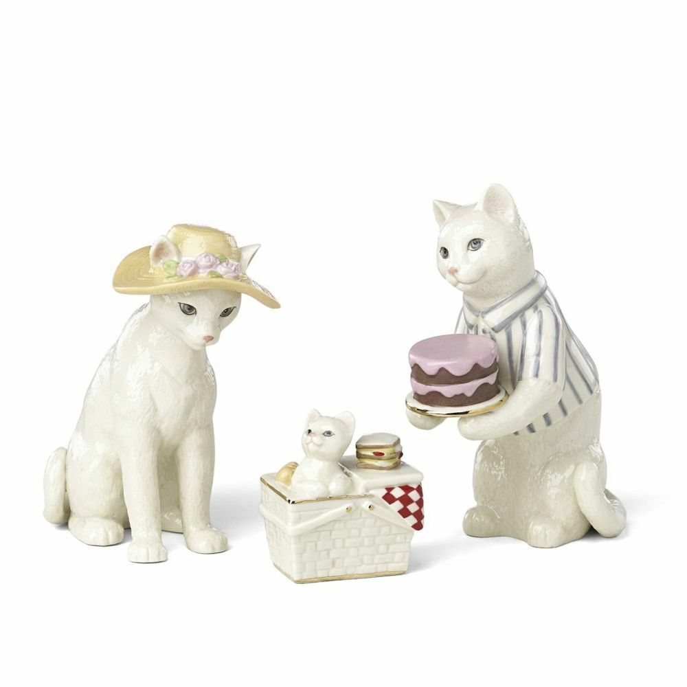 Lenox Cat Family Picnic Figurines 3 PC Victorian Kitten in Basket Hat Cake NEW