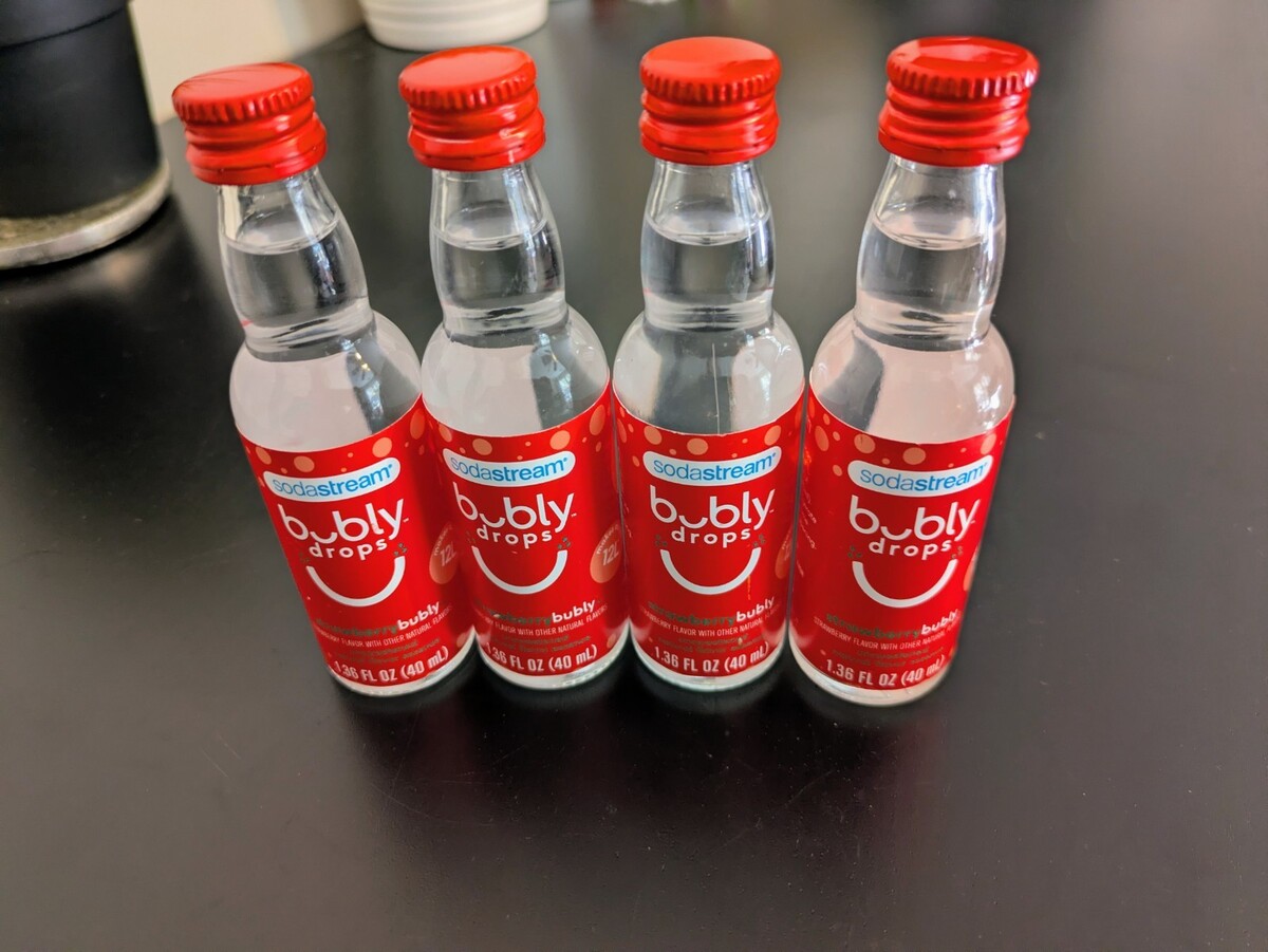 Pack of 4 new Bubly strawberry drops for Sodastream flavoring.