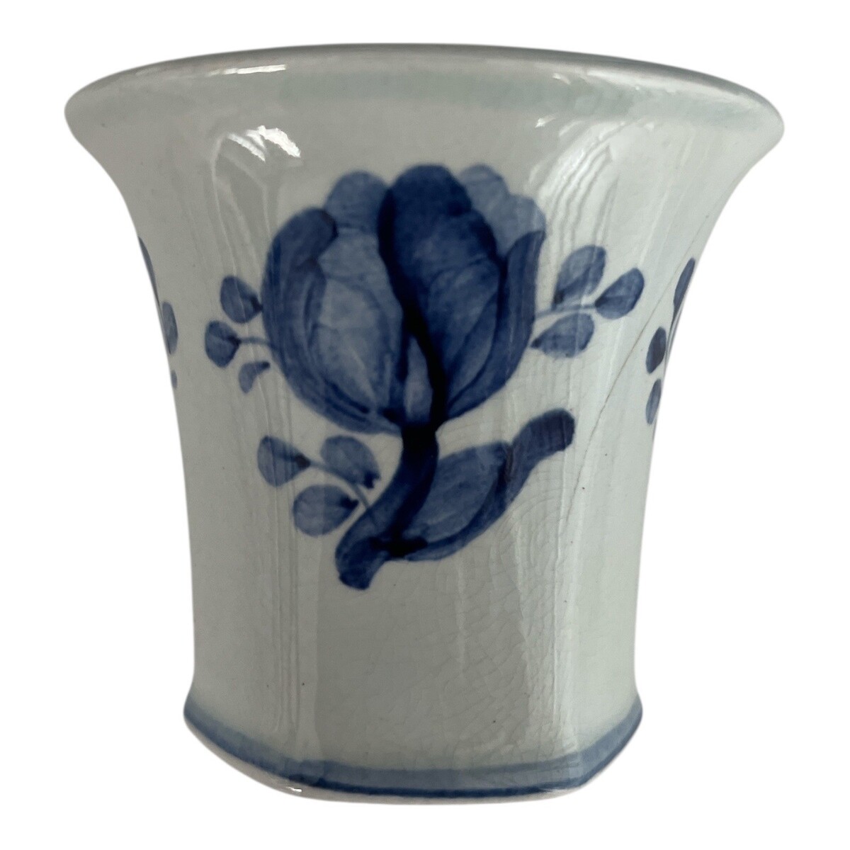 Vintage Danish faience pottery piece featuring a hand-painted blue floral design and a wide flared rim with inner border detailing. Likely made by Aluminia/Royal Copenhagen based on base markings. Hexagonal foot, classic cobalt-on-cream glaze, and visible age crazing throughout. Ideal for display, collections, or use as a miniature vase or toothpick holder.