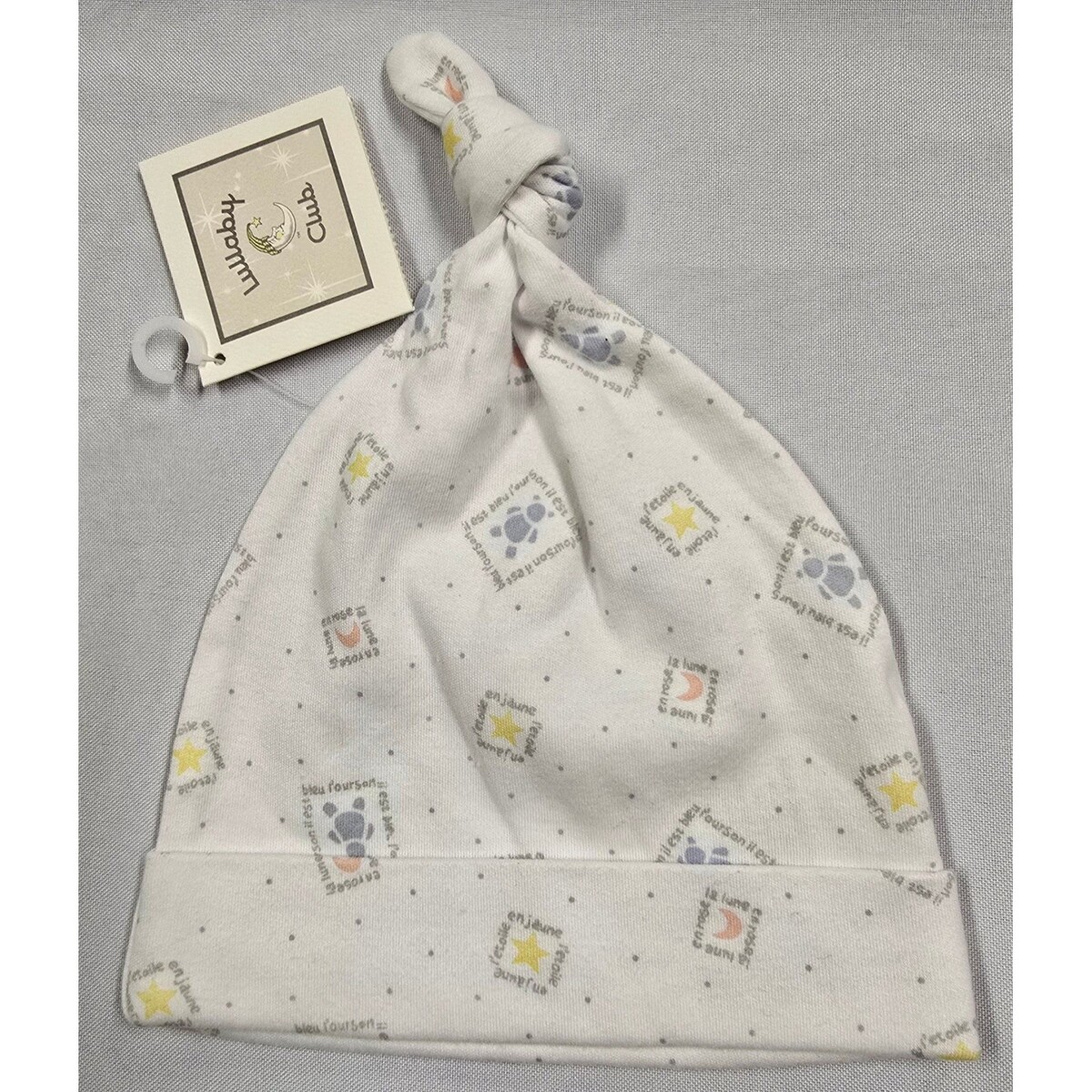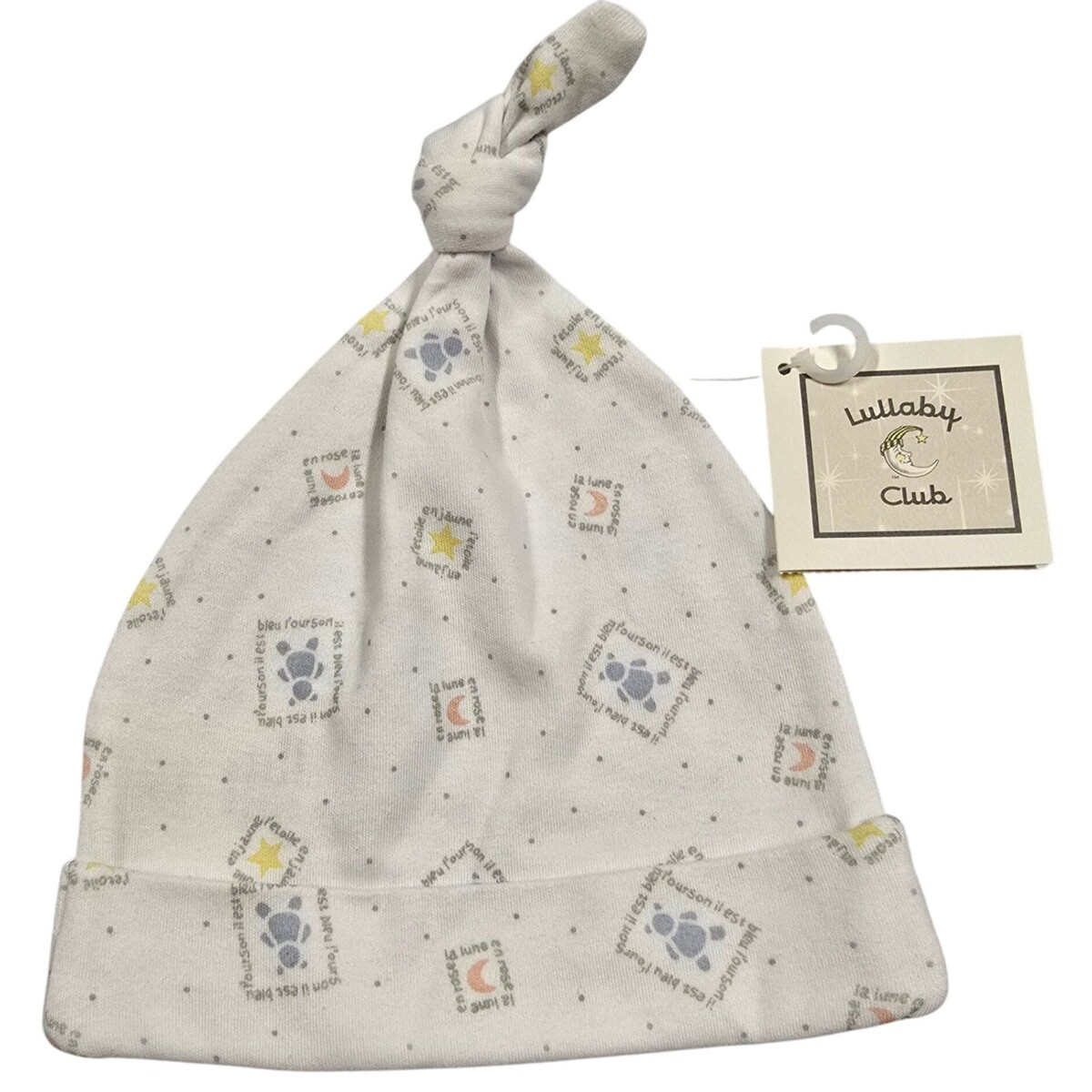 Keywords: baby hat, newborn, infant, cotton, celestial, stars, moon, bear, animal print, gender neutral, baby shower gift, hospital hat, knot top, soft, cozy. retro, deadstock