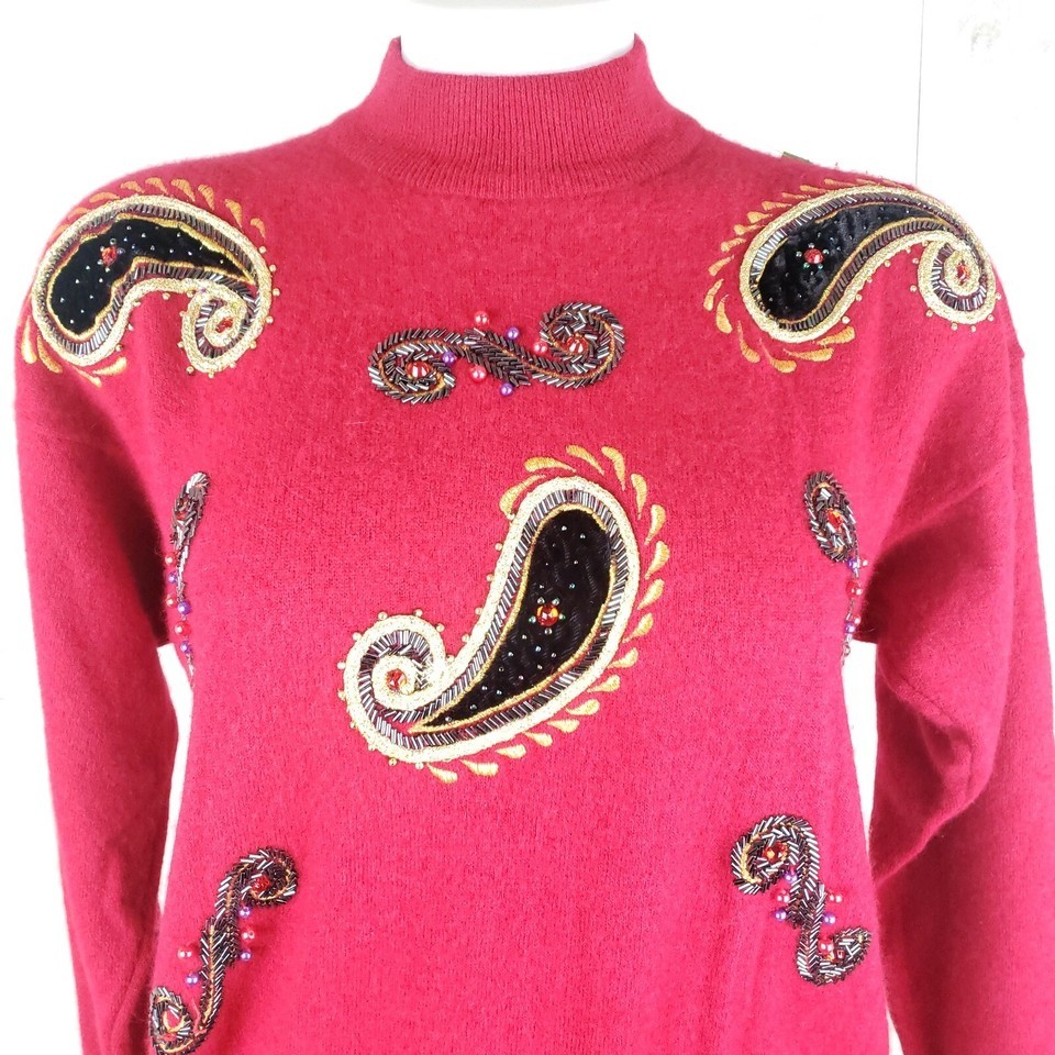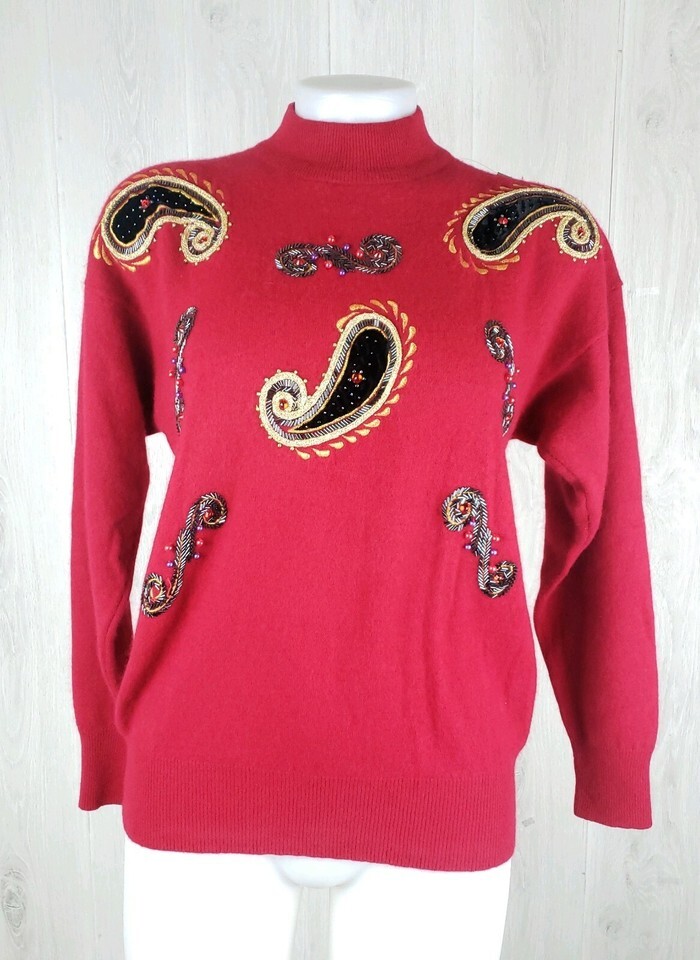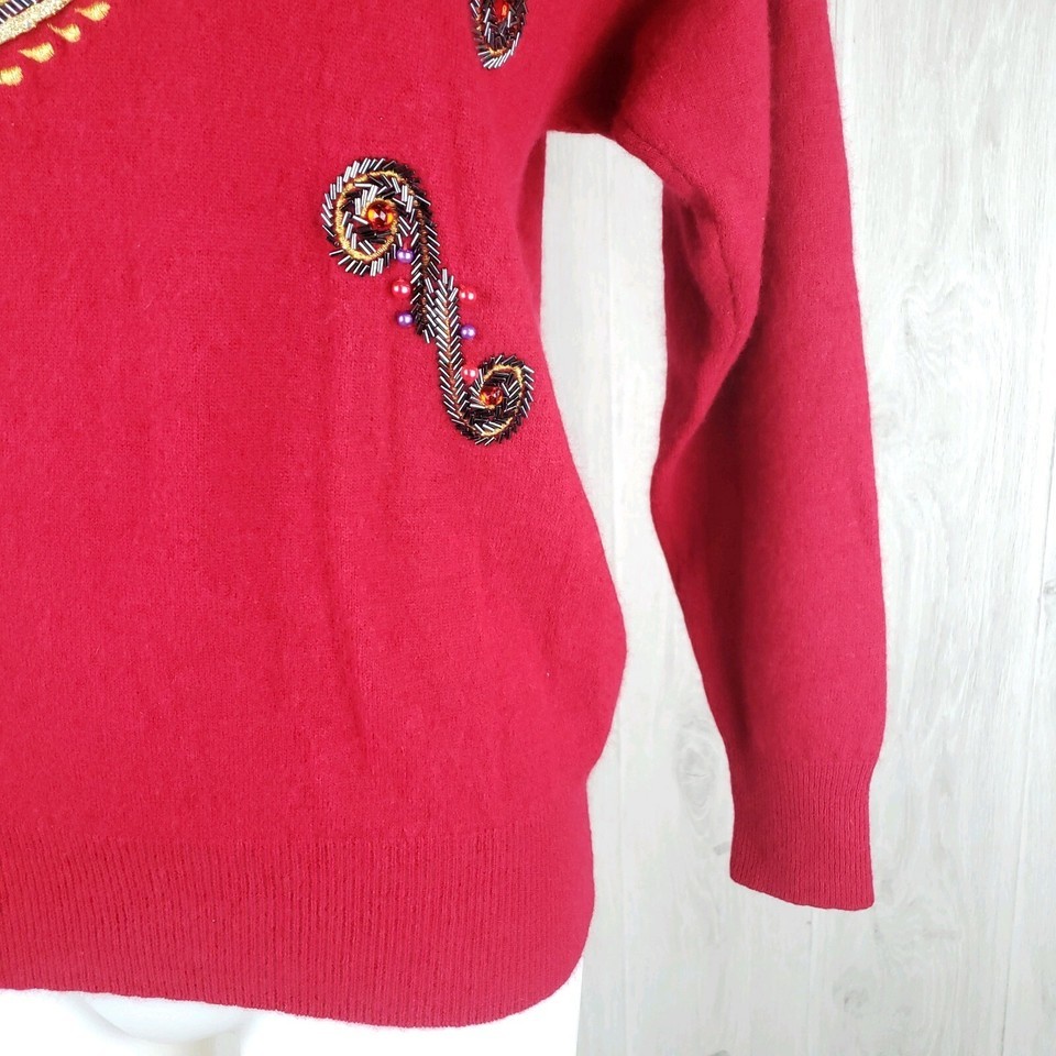 Angenie Size L Vtg Soft Lambswool Angora Rabbit Holiday Red Sweater Embellished