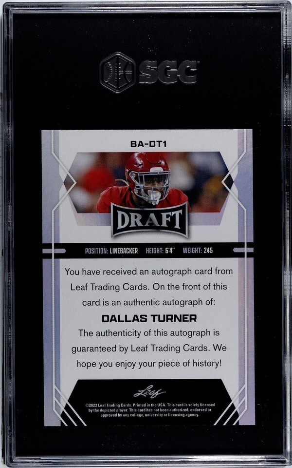 Up for sale is a rare and highly sought-after sports trading card featuring the talented Dallas Turner, a prized rookie autograph from the 2022 Leaf Draft. This card is a must-have for any serious collector and would make a great addition to your collection.