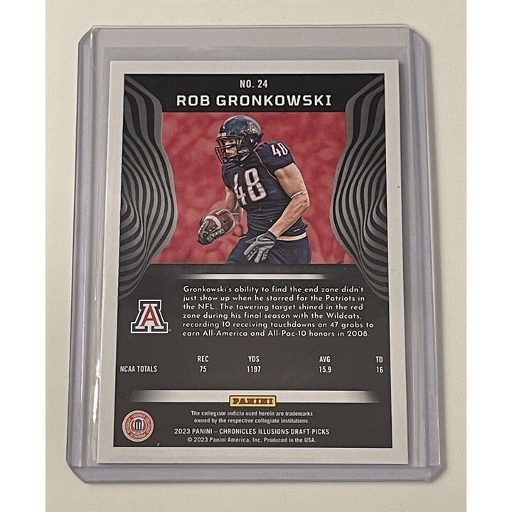 This 2023 Panini Chronicles Draft Picks sports trading card features Rob Gronkowski of the Arizona Wildcats. The card is made of aluminum and card stock, with a thickness of 20 Pt. It is an original insert set from the Illusions collection, manufactured by Panini. The card is not autographed and is ungraded.