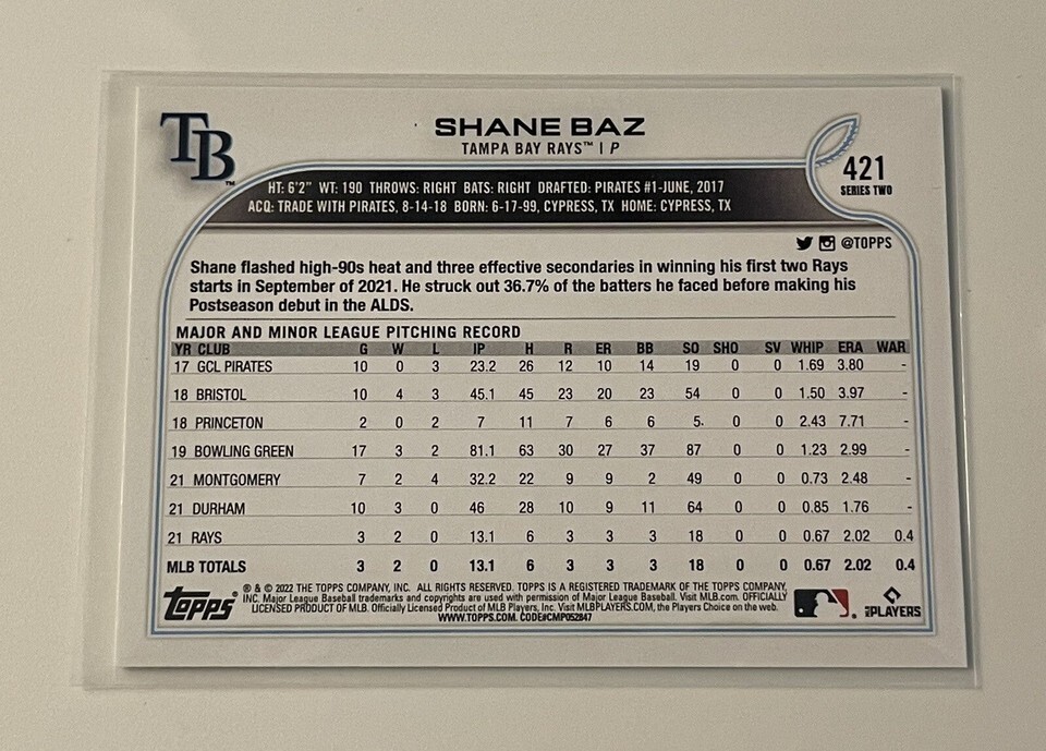 Shane Baz* RC 2022 Topps Series 2 Baseball Rookie Card #421 - MLB Tampa Bay Rays
