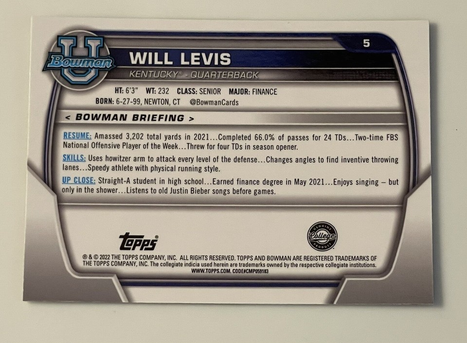 WILL LEVIS 2022 Bowman Chrome U NFL 1st ROUNDER Card #5 NCAA UK Wildcats/Titans*