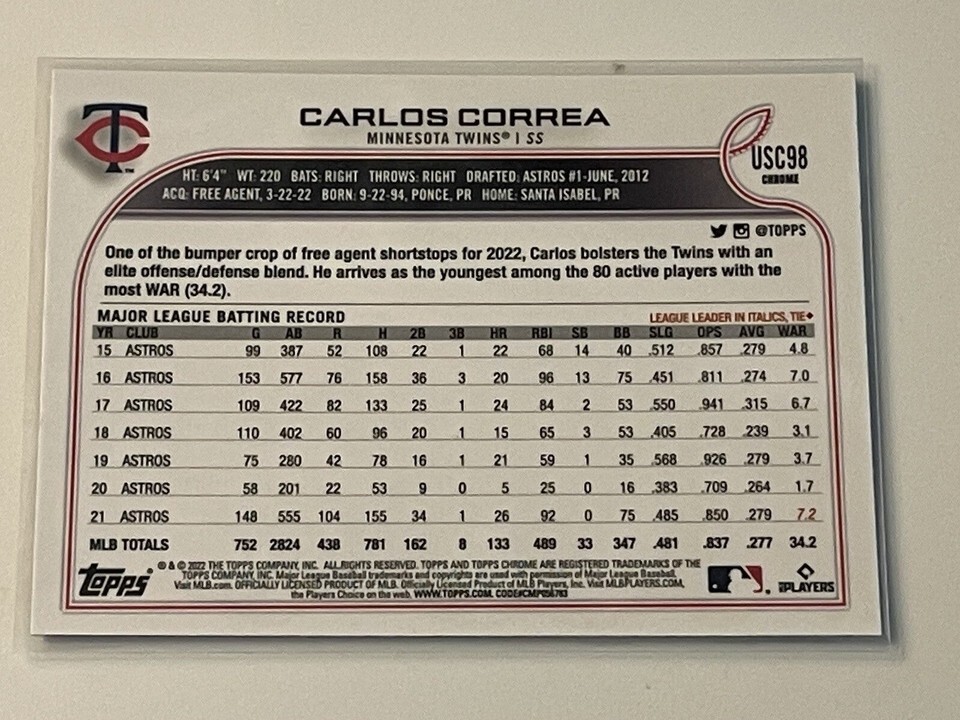 2023 Topps Chrome Carlos Correa Purple Refractor Card #USC98 MLB Minnesota Twins