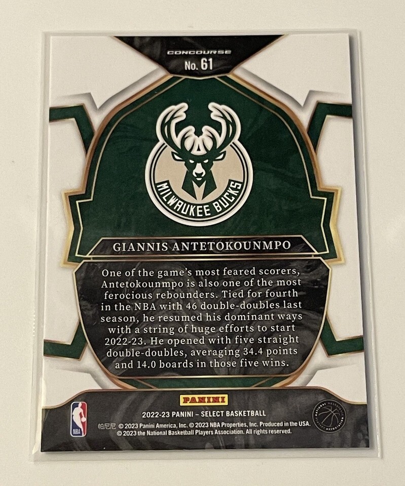 This 2022-23 Panini Select trading card features Giannis Antetokounmpo of the Milwaukee Bucks. The card is part of the Concourse set and is number 61. It also boasts a blue prizm parallel/variety, adding to its collectibility. The card is made of 20 pt. card stock and is in near mint or better condition.