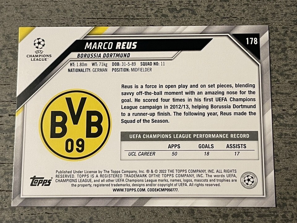 This 2021-22 Topps UEFA Champions League sports trading card features Marco Reus, the talented soccer player from Borussia Dortmund. The card is part of the base parallel/variety set and has the card number 178. It was manufactured in the United States in 2021 and is a great addition to any soccer fan's collection. The card is in standard size and is not autographed.
