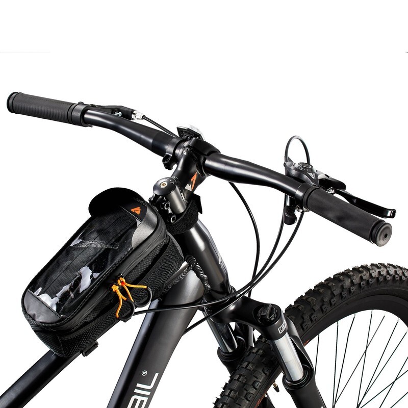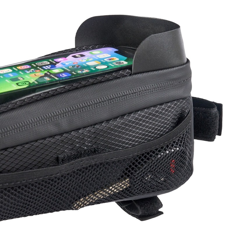 Phone holder and storage bag for bikes Fits most smartphones Integrated visor reduces glare Stores keys, ID and more Touchscreen compatible Mesh side pocket Easily attaches to bike