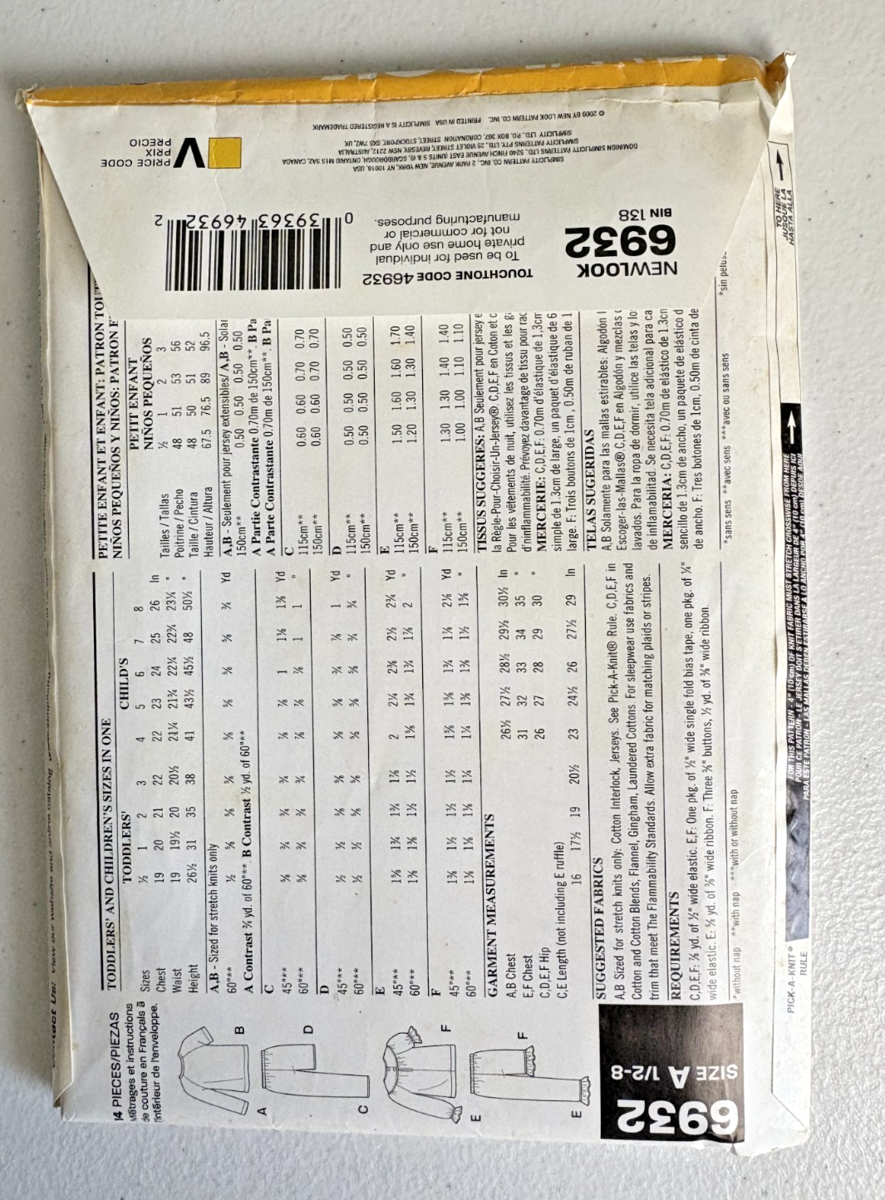 New Look 6932 Pattern Size A 1/2-8 Uncut 2009 Kids Pajamas. This is a new, uncut pattern - UPC #039363469322 - See Photos for further description.