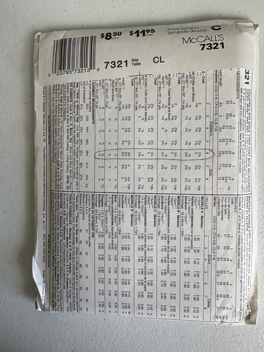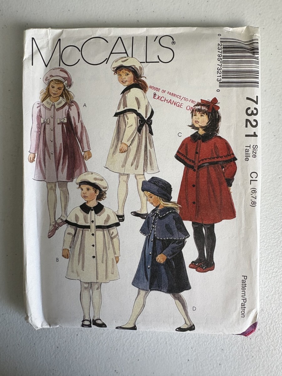 McCall's 7321 Pattern Size CL (6,7,8) Uncut Vintage 1994 Girls Coats. This is a new, uncut pattern - UPC #023795732130 - See Photos for further description.