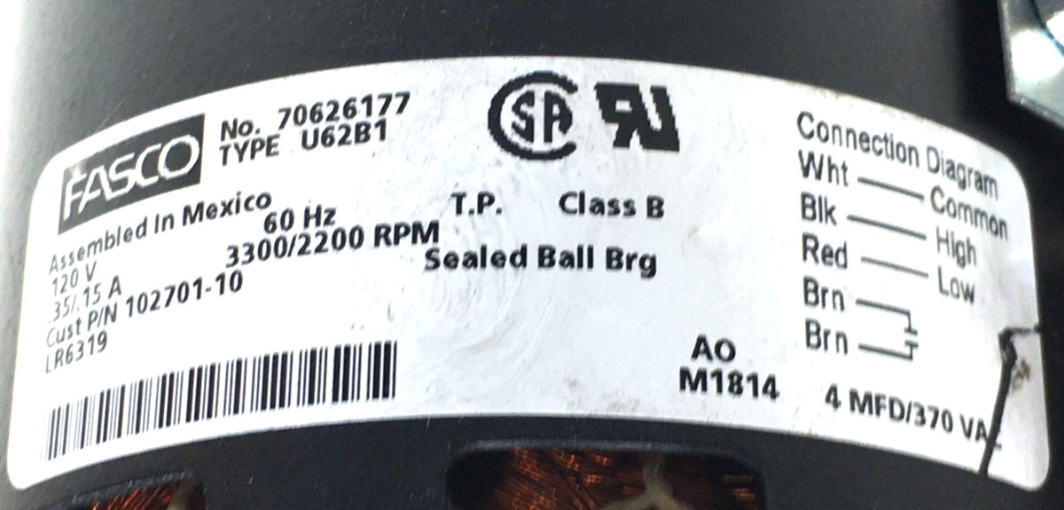 This is FASCO 70626177 62B1 Draft Inducer Blower Motor Assembly 102701-10 120V 3300/2200 RPM used part.