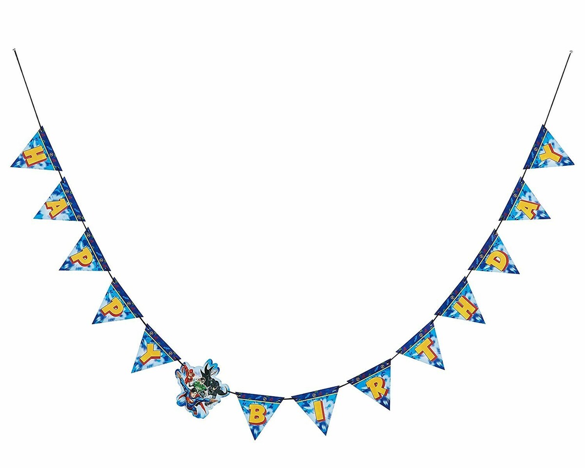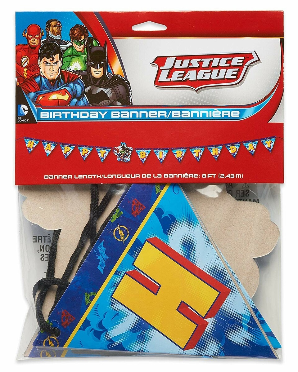 Justice League birthday pennant banner spells out Happy Birthday and features Superman, Batman, Green Lantern and Flash